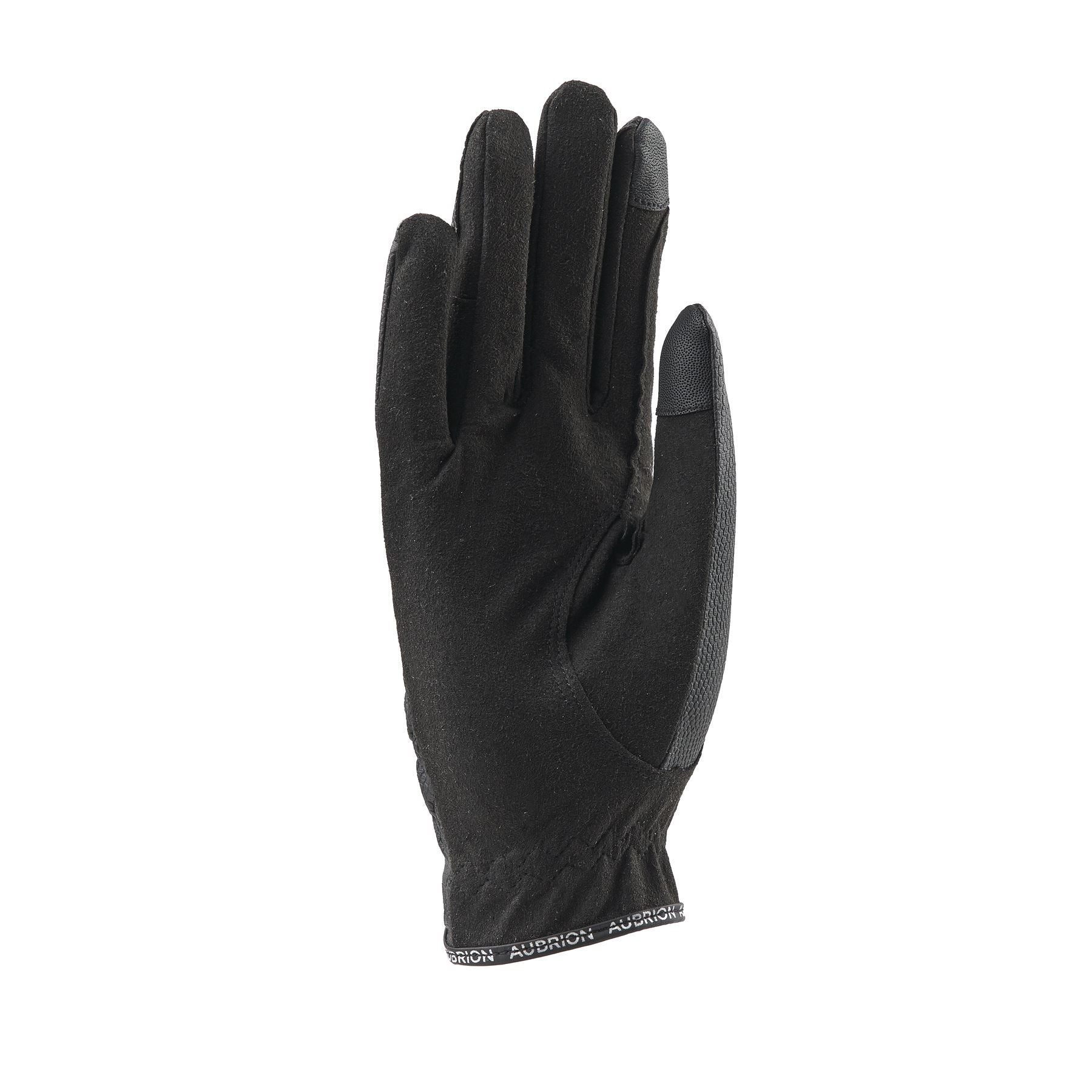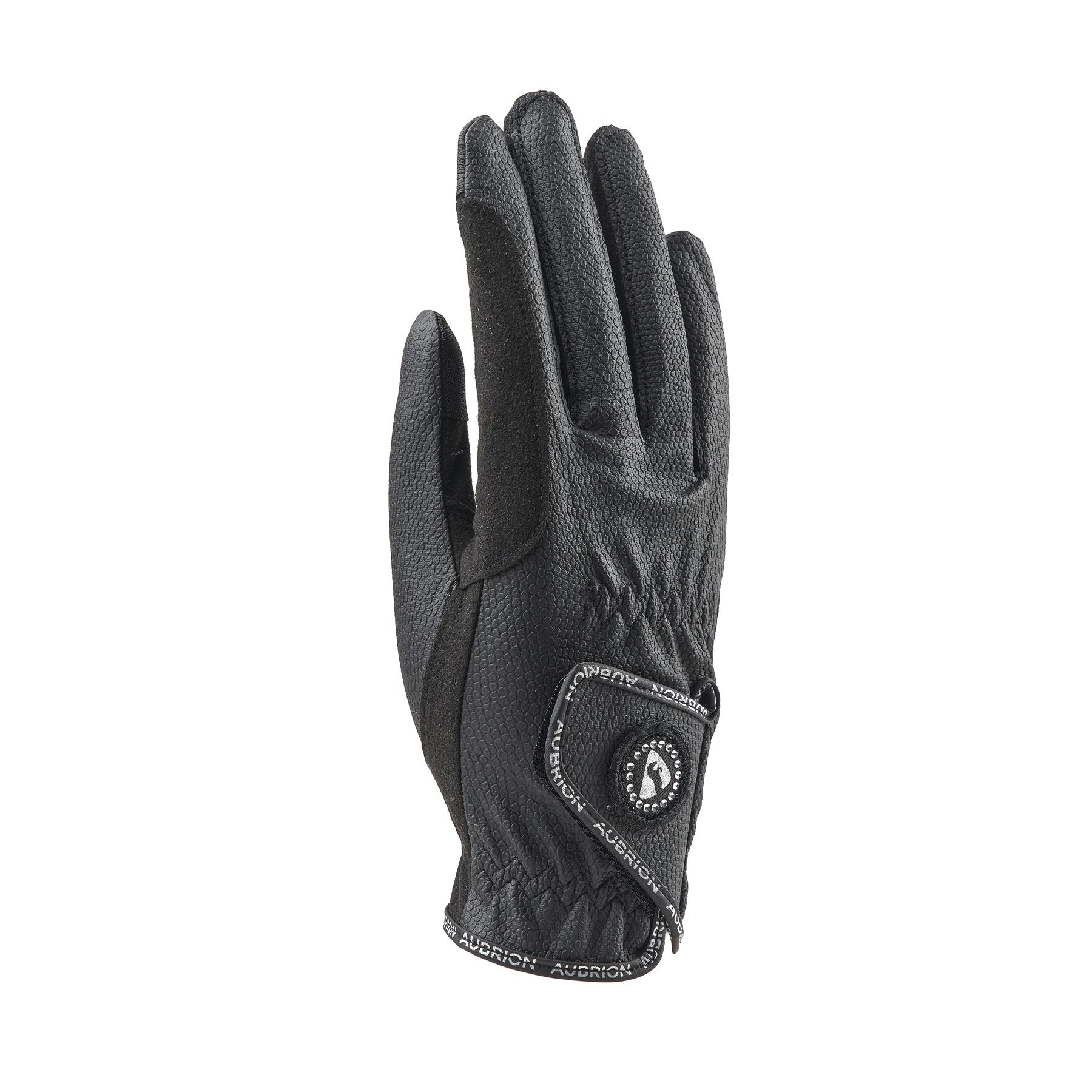 Smart and elegant, diamante detail gives the Aachen riding gloves great show presence, ideal for competitions. FlexFit fine synthetic leather features an attractive faux snake skin texture. The DuraGrip palm and finger grips provide a secure wet or dry hold on the reins, a close contact feel gives greater connection. Touchscreen compatible forefinger and thumb (Black, Brown & Navy colours) ensures convenience on the go. Thumb articulation and stretch fabrics give a free feel, stitch gathered across the knuckles flexes with the hand. Deep wrist openings have non-scratch touch close fastenings, the elasticated cuff edge gives a neat fit. Finished with signature trims and an Aubrion emblem badge.