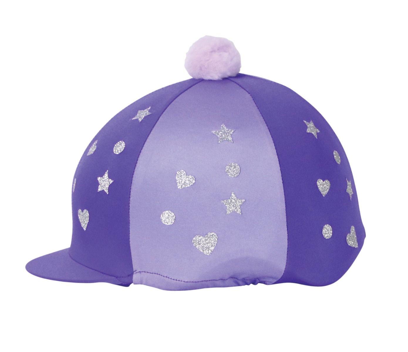 A glittery hat cover featuring hearts and stars and matching tonal pom pom. Made from stretchy fabric to fit all sizes, this cover also features a stiffened peak.