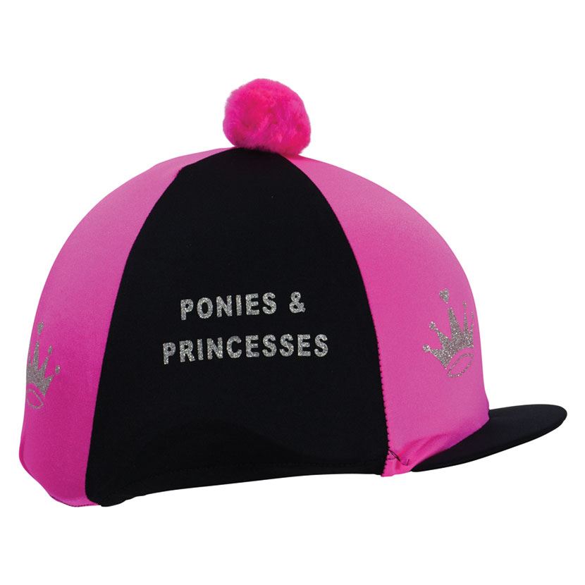 Add a bit of fun to your riding outfit. Adorned with glittery tiaras and the slogan �Ponies & Princesses� in a gorgeous sparkly silver detailing, this hat cover is certainly eye-catching, complete with matching pom pom. Featuring a stiffened peak, made from stretchy material that fits all hat sizes and stays securely in place. The perfect fun accessory for your little Princess!