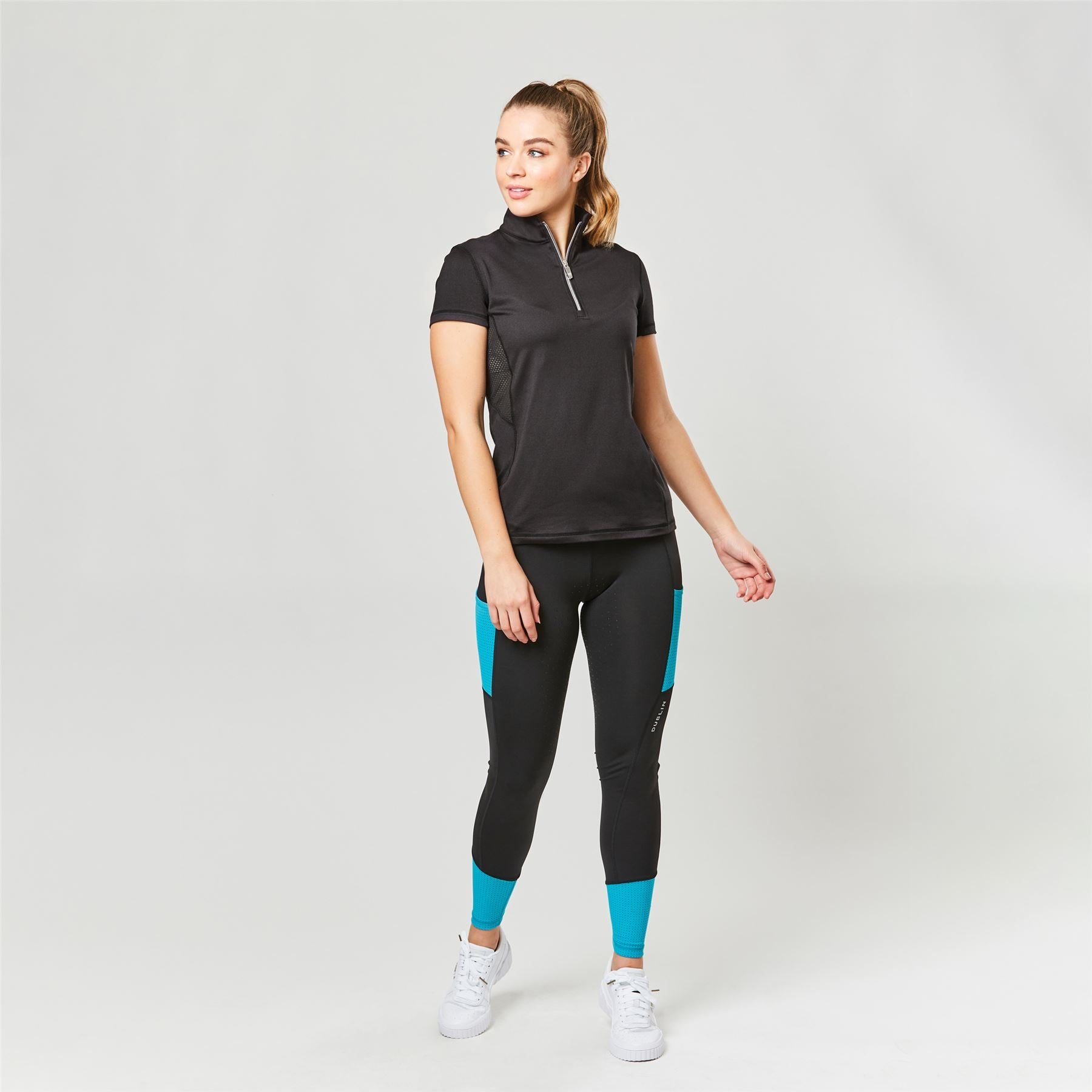 Your go to riding tights that you can wear in the yard or while being active. Athletically designed with stretch polyester fabric and technical features that include Comfort Dry technology. This system ensures any moisture dries quickly to keep you cool, comfortable and dry. The modern colour block panels offer an athletic look, with handy side phone pockets and cuff in laser mesh, that's a perforated fabric. Featuring back zip pockets to store your essentials and seamless Ezi-Grip Gel full grip silicone print seat for stability.