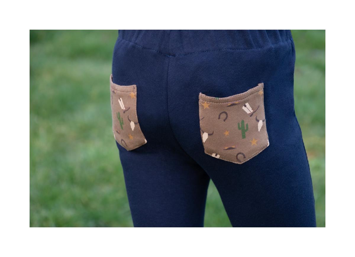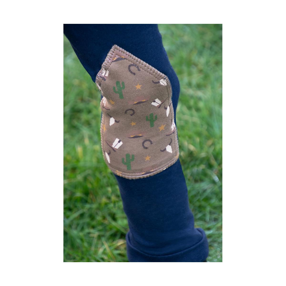 Perfect a little cowboy's day on the ranch! These gorgeous navy jodhpurs are made from a durable material making them ideal for adventures. Featuring a fun cowboy print including boots, Stetsons and cacti on the pockets and knees. The elasticated waistband makes dressing easier for your child and means they are super comfortable for your little sheriff.