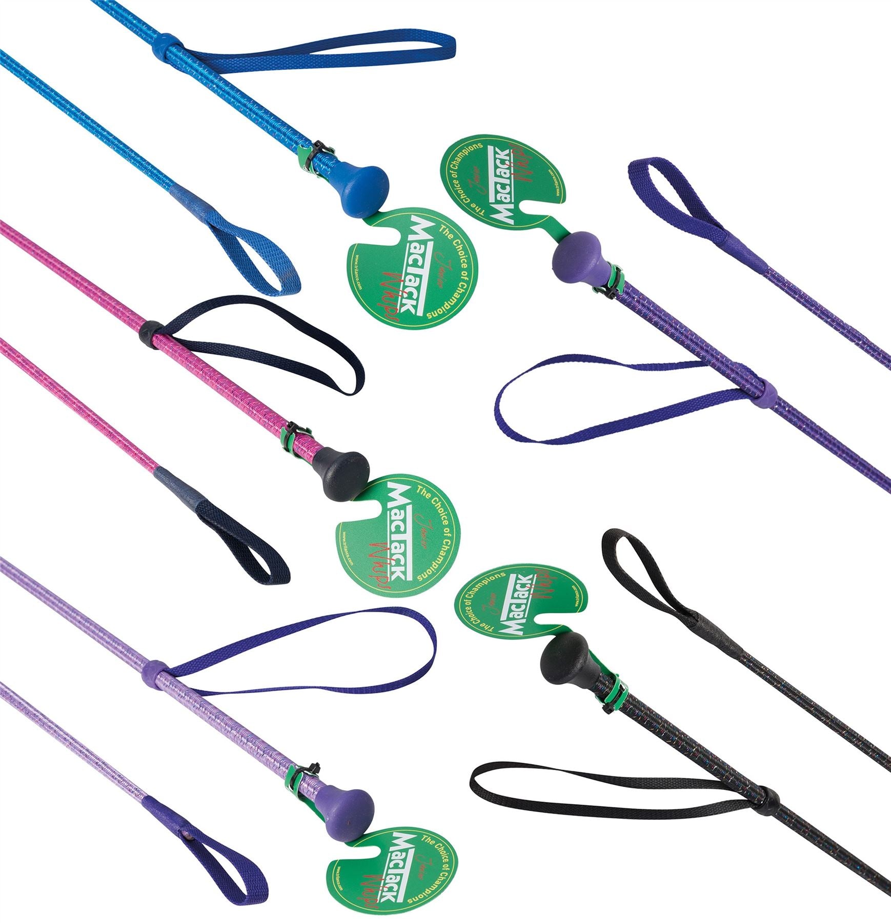 This Junior riding whip from MacTack comes as a 24" sparkle braided stock with web keeper and wrist loop & mushroom cap.