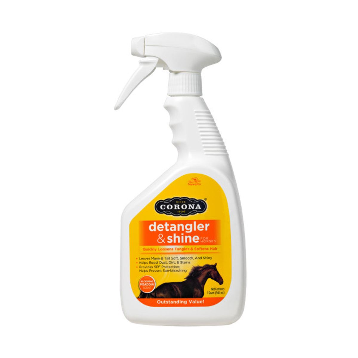Corona Detangler & Shine provides SPF protection to help prevent from the sun-bleaching of manes and tails. Quickly loosens tangles and leaves a soft, smooth, and shiny finish. Helps repel dust, dirt, and stains to keep your horse looking its best.