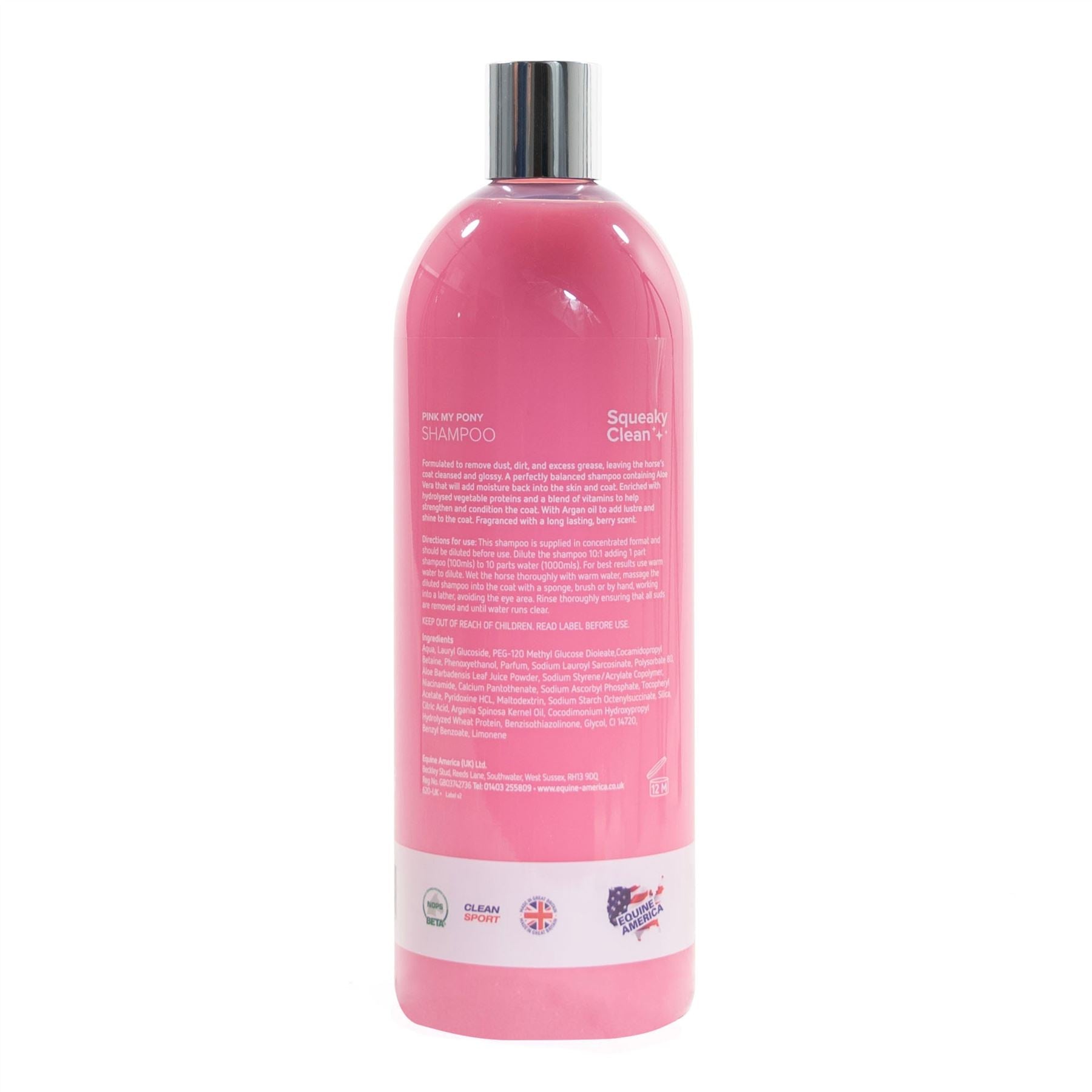 Squeaky Clean Pink My Pony, carefully formulated to get that shine and lustre in your horse or pony. Formulated to remove dust, dirt and excess grease, leaving the coat cleansed and glossy. A perfectly balanced shampoo containing Aloe Vera that will add moisture back into the skin and coat. Enriched with hydrolysed vegetable proteins and a blend of vitamins to help strengthen and condition the coat. With Argan oil to add lustre and shine to the coat. Fragranced with a long lasting, berry scent.