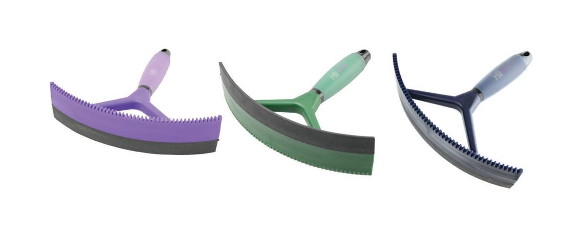 This is a Sweat scraper with a comfortable gel handle and a rubber edge on one side to remove excess water from the horse's coat. The other side consists of a coarse curry comb for the easy removal of mud.