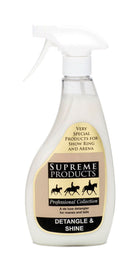Supreme Products Detangle & Shine keeps show manes and tails tangle-free and lustrous throughout the season. This non-aerosol spray is an excellent detangler for winter use also.