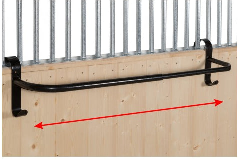 Great new extendable rug rail that is even easier to use outside the stall. Great for shows too. It simply hooks on to wall or door up to 75mm thick, suiting any bar spacing so long as bars are over 40mm apart. Safely extends from 73cm/29” to 107cm/42”. Highly portable, this has no fixings. However, both ends are provided with a hole for a screw if permanence is preferred. Really handy lower hooks at each end are great for head collars, bridles, jackets etc. Strong steel construction. Black