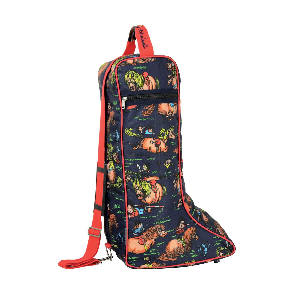 Transport and store boots in style with this fun, bold boot bag. This funky bag is covered in classic Thelwell characters that are sure to make you smile! Made with a waterproof nylon outer and secured with a duo zip fastening, it will keep boots dry and clean. Also features a zip side pocket, grab handle and over the shoulder carry strap.