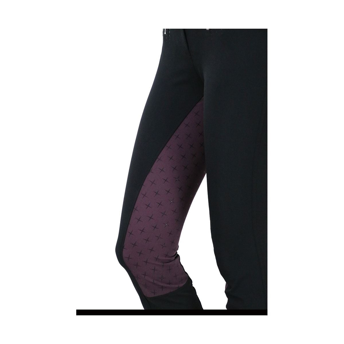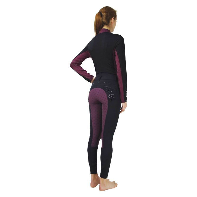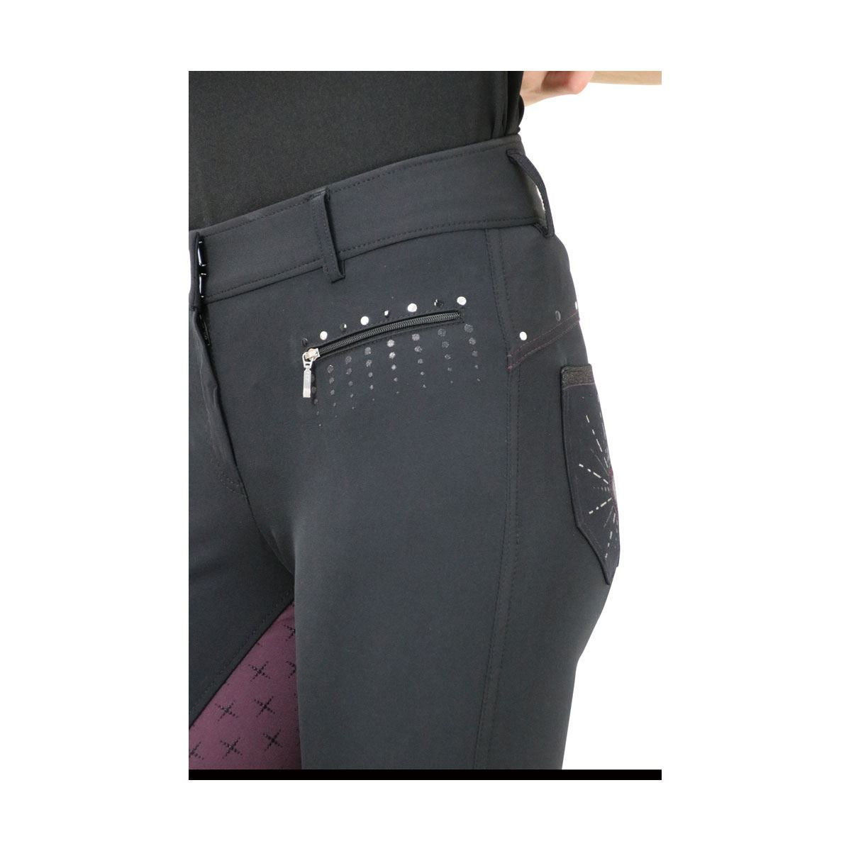 A stunning pair of high waisted breeches from the Knightsbridge collection by Hy Equestrian helps to support the active rider to ensure a comfortable ride. They are designed using a 4-way stretch breathable material, allowing extra movability and comfort. A full silicone seat offers extra grip in the saddle. The no bulk stretch hems means these breeches can be paired with long boots as well as short boots. The elegant black and fig design creates a sophisticated look. Diamante�s aligning the pocket and a beautiful design on the pockets add a bit of bling.