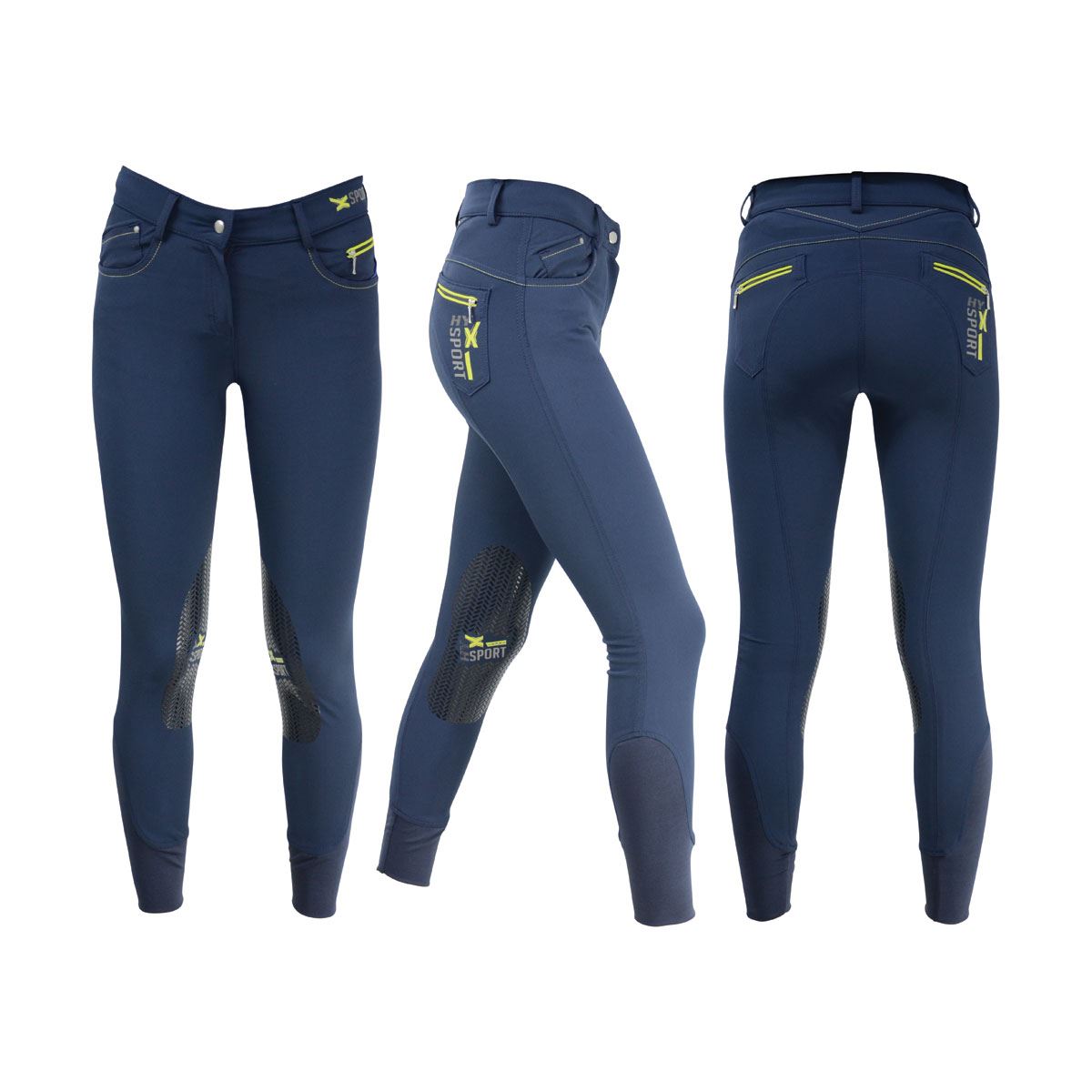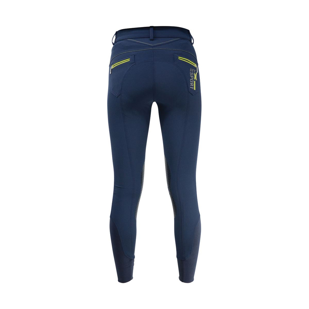 A breech designed to be used for hard wearing sport. Made with bi-stretch durable material, these breeches offer maximum comfort and flexibility when riding. A silicone knee featuring Hy X Sport Logo offers maximum grip in the saddle, whilst no bulk stretch hem ankles enhance comfort of the ankle in the boot. Contrasting lime green is used for stitching around the pockets and piping along the zips giving a stand out look. The Hy X Sport Logo also features along the waistband and back pocket, once again adding to the dynamic look of these breeches.