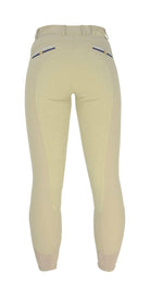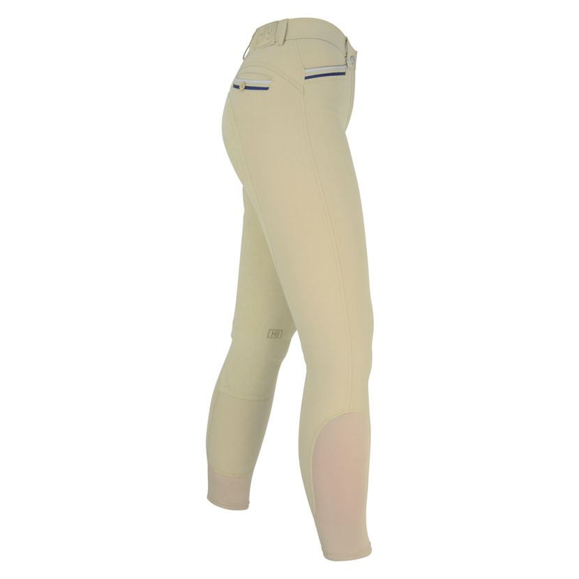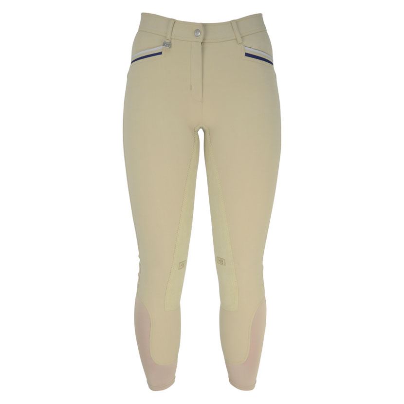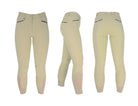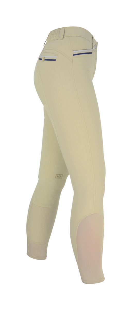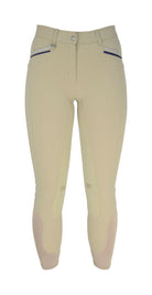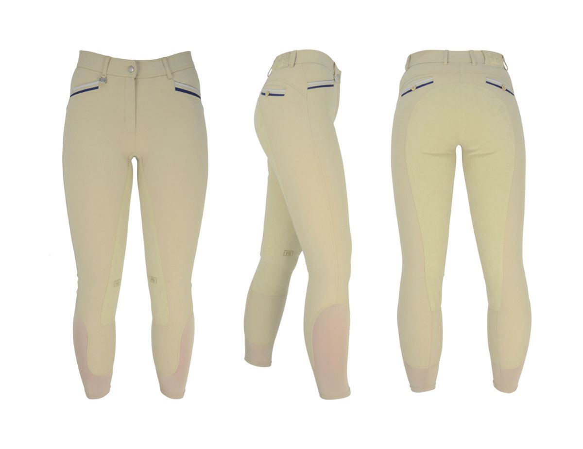 The perfect choice for the competitive rider. These stylish breeches have flattering two tone ribbon detail on the front and back pockets, and are combined with a leather seat for added smartness. Featuring an elasticated side panel on the lower leg for ease of getting on and off. Machine washable. Leg length: Regular.