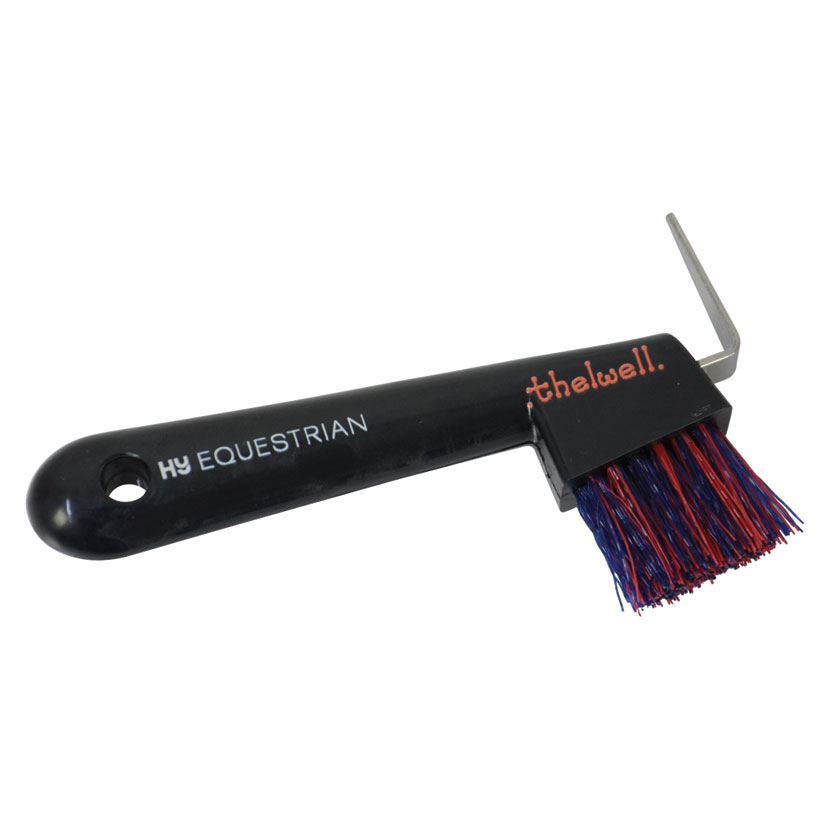 This handy hoof pick with two-tone bristle hoof brush and a stainless steel hoof pick, has both the Thelwell and Hy Equestrian logos printed on the handle.