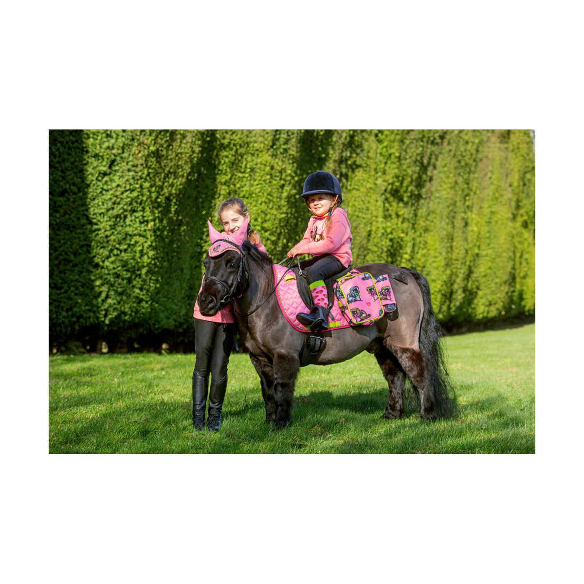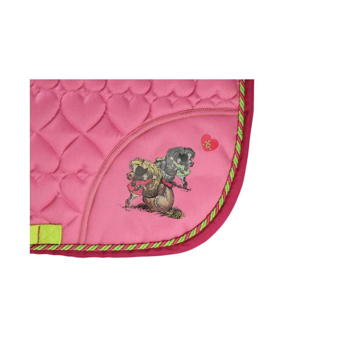 This breathable saddle pad from the Thelwell Hugs Collection is ideal for any pony lover! Featuring heart quilting for both style and comfort, this pad also has hot pink and lime green detailing, including the binding and girth straps. Cute Thelwell cartoon finishes off the pad perfectly
