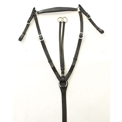 This is Made from the finest quality leather, this breastplate has an adjustable neck strap with elastic sections for ease of movement, a padded wither piece, a running martingale attachment and buckle adjustments.