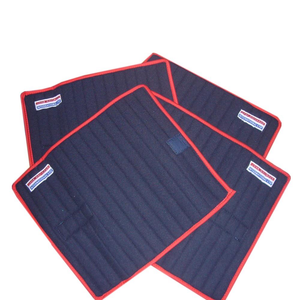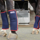 Made from a high IQ cool comfort fabric with perspiration protection to keep your horse cool and dry. The long lasting fabric is machine washable and edged with a red binding. Set of 4. FEATURES: - Navy and red trim - Velcro fastenings - Ideal for stable use - These wraps are made in a soft warm material to enhance comfort for your horse - John Whitaker logos - Only available in navy - One size only