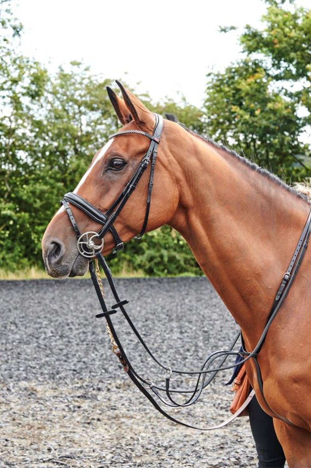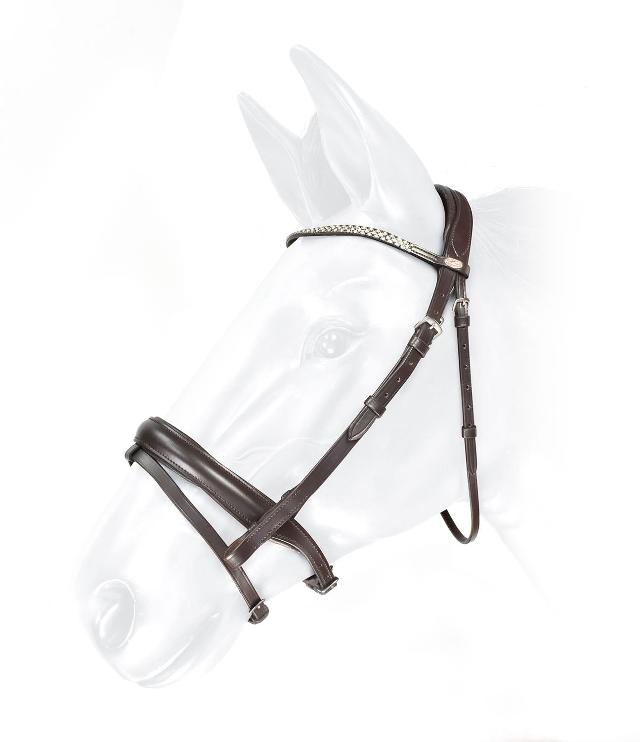 Featuring a wide headpiece and noseband with a super soft rolled leather padded, flash strap with fixed attachment. There is tonal stitching throughout and a stunning checkerboard diamante browband. Crafted from an eco-friendly vegetable tanned leather.