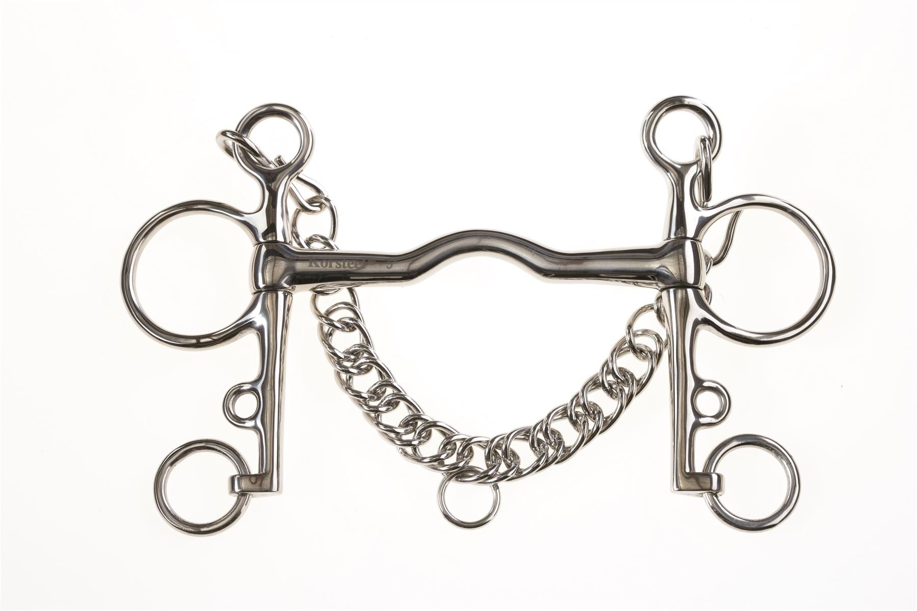 The port in this pelham creates more space for the horse's tongue. Can be used with double reins or pelham roundings.