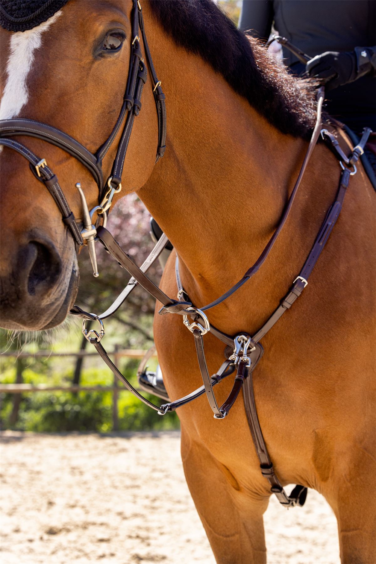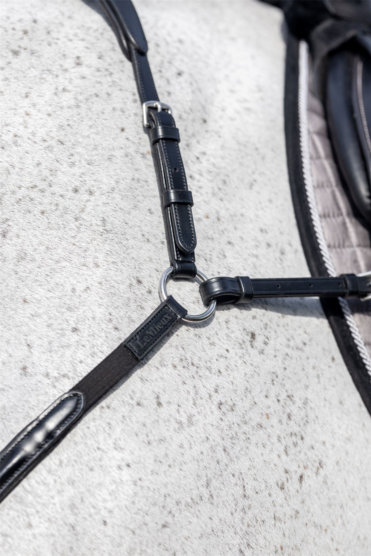The LeMieux Breastplate with Martingale attachment is the ideal solution for your tack room with a smart appearance and practical functionality. An adjustable top piece sits with a soft leather pad at the wither and attaches to the elasticated neck straps. The padded cushioning behind the connector on the chest adds to the comfort for the horse, featuring a removable running martingale attachment with handy clips, durable metal fixings and easy to use buckle closures. The custom designed martingale rings clip on and off reins easily without the need to undo them. LeMieux leatherwork is made from beautifully soft European leather and has been designed to aid in the distribution of pressure and maximise comfort. Adjustable, gel padded piece sits on top of the neck at the wither Elasticated neck straps Padded cushioning behind the connector Custom designed martingale rings clip on and off the reins Martingale straps are fully detachable and adjustable and clip onto main connector Trigger clips attached onto the D-rings, making sure the saddle stays securely in place Colours: Black with Silver Fittings and Havana with Brass fittings