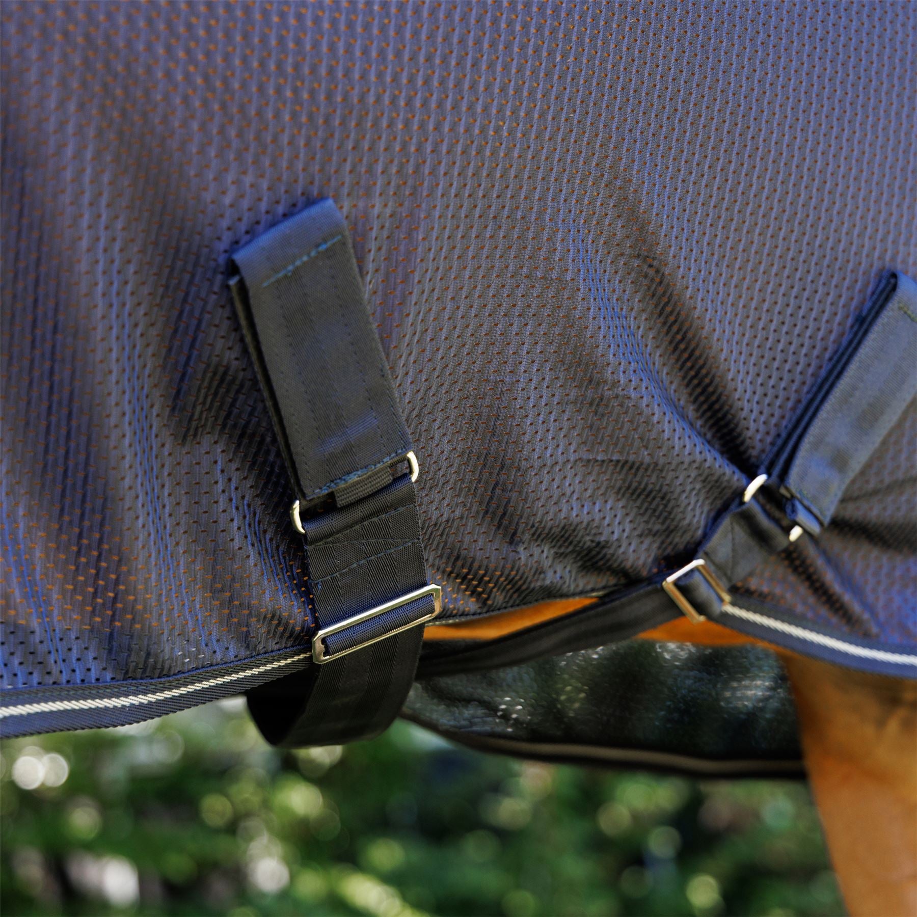 The F1 racing car of coolers, this sportive and technical rug uses 3D technology to control airflow while regulating muscle temperature across key muscle groups in the shoulder, back, and hindquarters. Safe and gentle cooling is vital to maintain your horse�s healthy muscles. The shoulders and topline are covered by a stretch-lined 3D mesh, cleverly contoured for optimum fit and temperature control across your horse�s major muscle groups. Beneath, a close weave mesh skims the lower shoulder, elbow area, sides, and flanks to allow fresh air circulation. The expertly designed performance cut of this sports cooler rug makes it the ultimate companion to keep your horse�s key muscles warm after exercise, between classes, when traveling, or under other rugs. Security and comfort are assured with a design-registered front closure. The top of two sturdy T-bars is 45� angled to relieve pressure across the point of the shoulder, for comfort and freedom of movement. Adjustable crossed surcingles and a soft cord fillet string ensure you can comfortably fit the rug close to your horse�s body for the maximum cooling effect. Its technical, open weave structure makes it unsuitable as an outer stable rug; it�s best used as an under rug or for short, attended periods of cooling only. Technical Specification 3D sports mesh topline panel Lightweight mesh skirt Open-weave texture Design-registered angled 45� T-bar front closure Crossed surcingles Rear cord fillet string