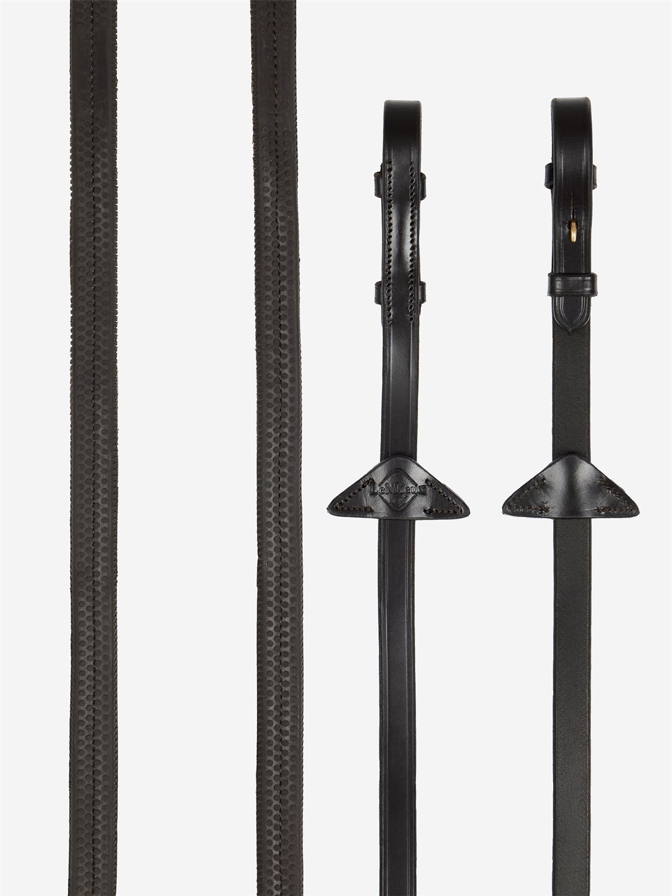 The LeMieux Rubber Reins are practical reins that have a light grip feel in the riders' hands to suit any rider. With anti-slip texture for additional grip and nylon lining to prevent stretching. Complemented by the branded Leather martingale stoppers.