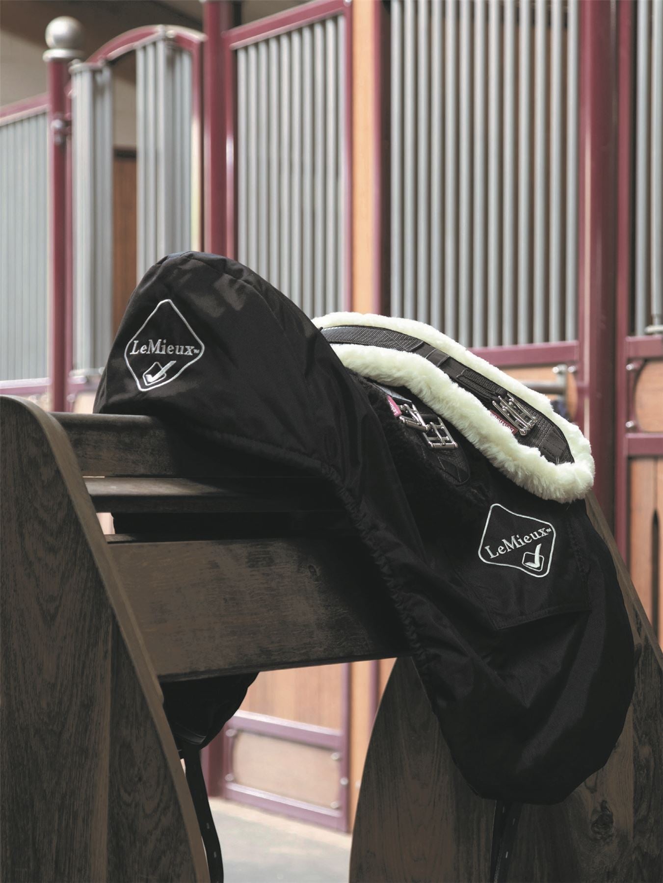 LeMieux ProKit saddle cover is made of a durable, waterproof polyester outer with a soft fleece lining to protect the saddle. Waterproof rating of 3000mm. The adjustable elastic drawstring allows it to fit most shapes and sizes of Dressage saddle for a snug fit, while the over sleeve allows you to keep your girth secure on top of the cover to keep your saddle clean. A lower slot at the bottom on each side is designed to pass the girth straps through for added security.