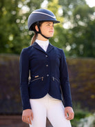 Our signature LeMieux premium show jacket, scaled for young riders. Built for competition, it has perforated side vents lined with performance air mesh for comfort and breathability. Sophisticated crystal details on the collar, back belt and split tail tips give a sophisticated edge, while subtle LeMieux branded finishing touches on the hip and arm convey quiet confidence. Generous side zip pockets and a durable front zip with distinctive LeMieux branded poppers lend practicality to this show-stopping jacket.