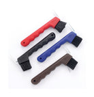 Strong hoof pick with plastic body, metal pick and nylon brush for removing excess dirt.