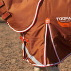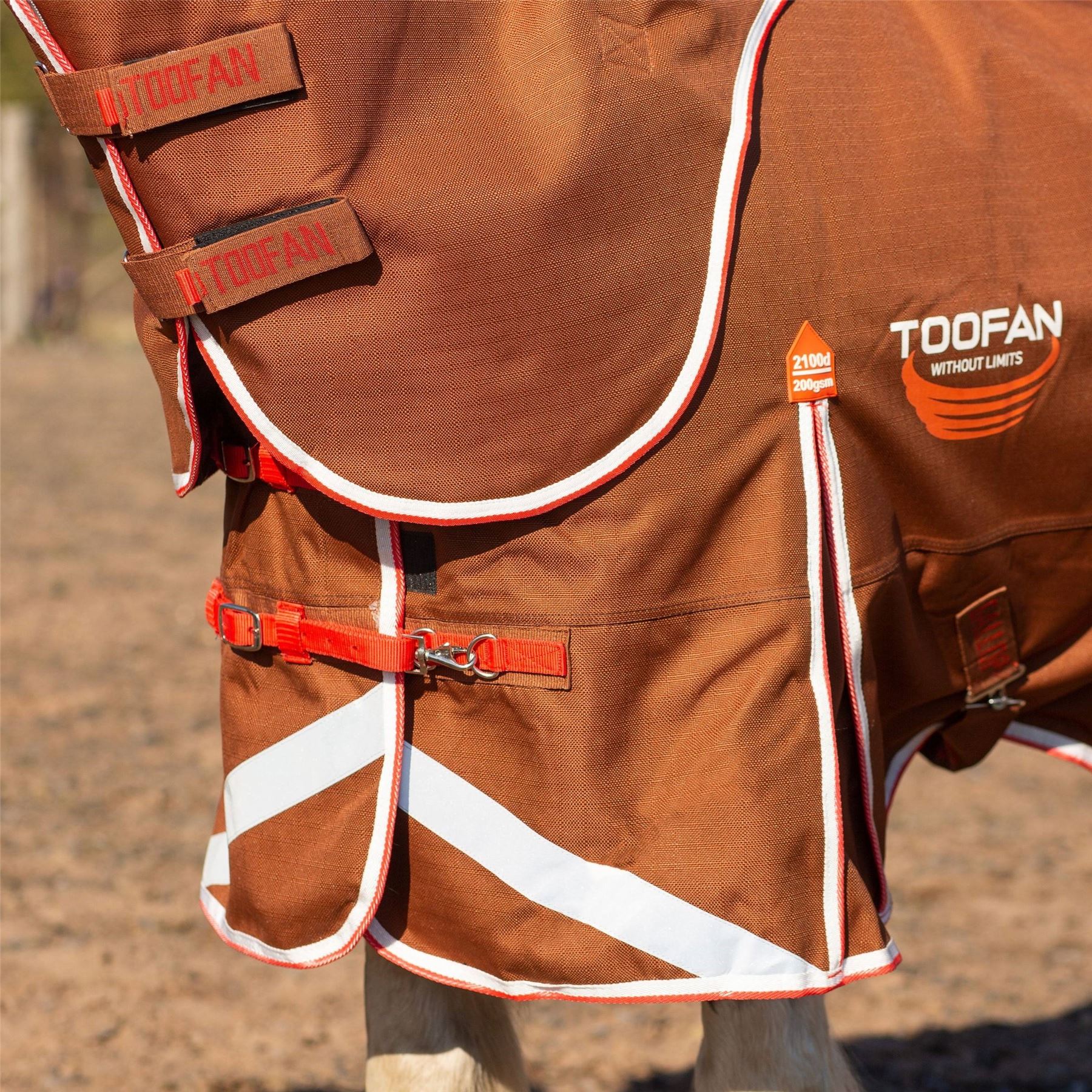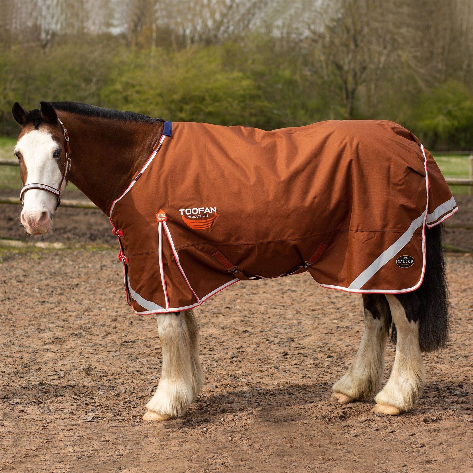 The All New Gallop Toofan 2100D 200g Dual High Performance Ripstop Turnout is ideal for days ahead in colder weather. An enhanced, stronger and more hardwearing fabric ensures resilient protection for all seasons. Features a durable, tough, waterproof and breathable windproof outer with taped seams, deep shoulder gussets, fully nylon lined, adjustable clip chest straps, adjustable cross surcingles and reflective strips and tail flap., 2100d ripstop outer, 200gsm insulated fill, Waterproof, Breathable, Windproof, Nylon lining, Cross branded surcingles, Elasticated detachable leg straps, Tail flap, Shoulder pleat to reduce rubbing, 3D Wide Reflective Strips, Multi Adjustable Quick release front fastenings, Detachable neck with double back neck closureColour: Toffee BrownSizes: 5'6� - 7'0�