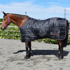 The Dunford 200g Stable Rug Features 2x adjustable t-clip chest fastenings Crossed belly surcingles Fillet string Velcro chest catch navy/lime accents on the logo.