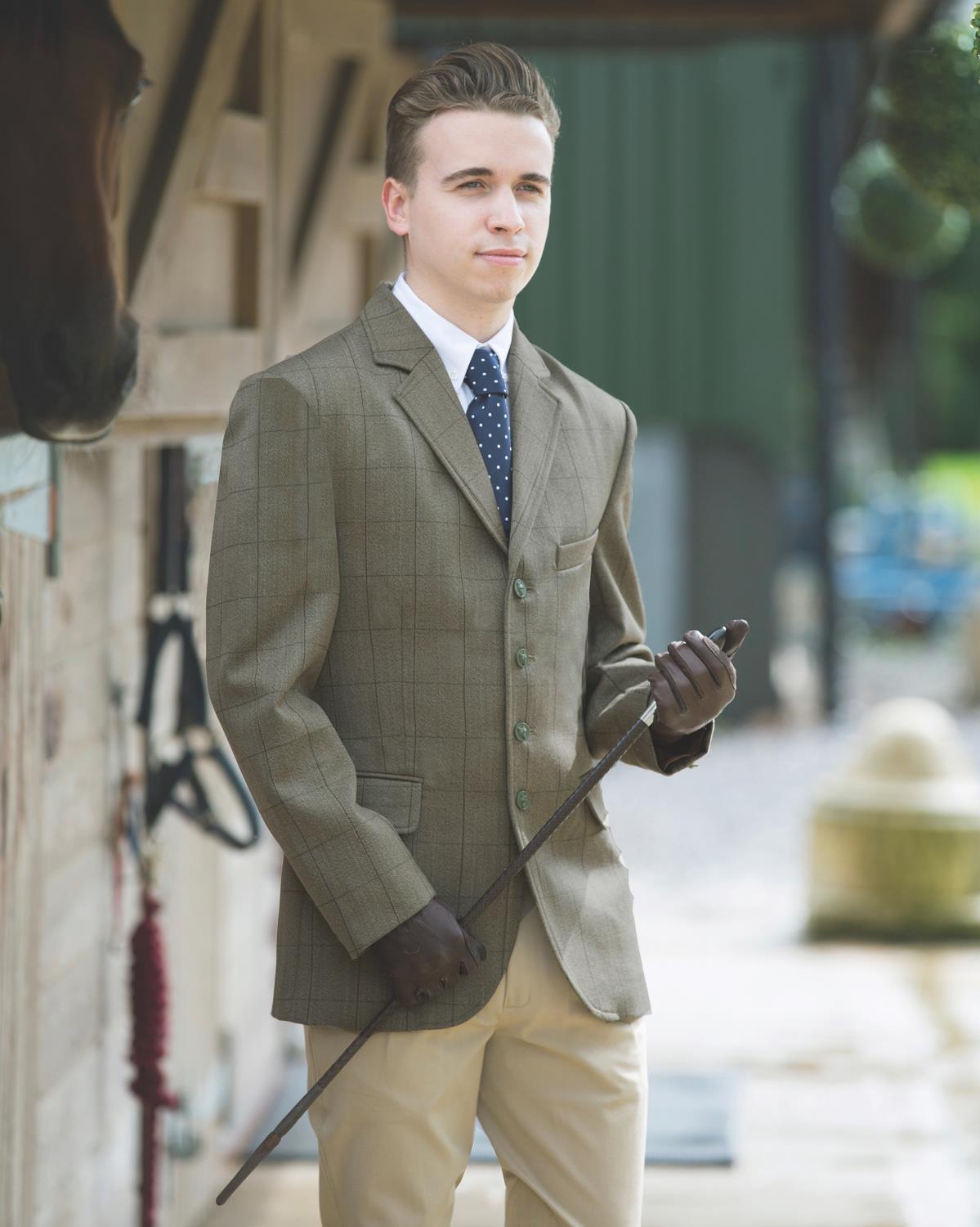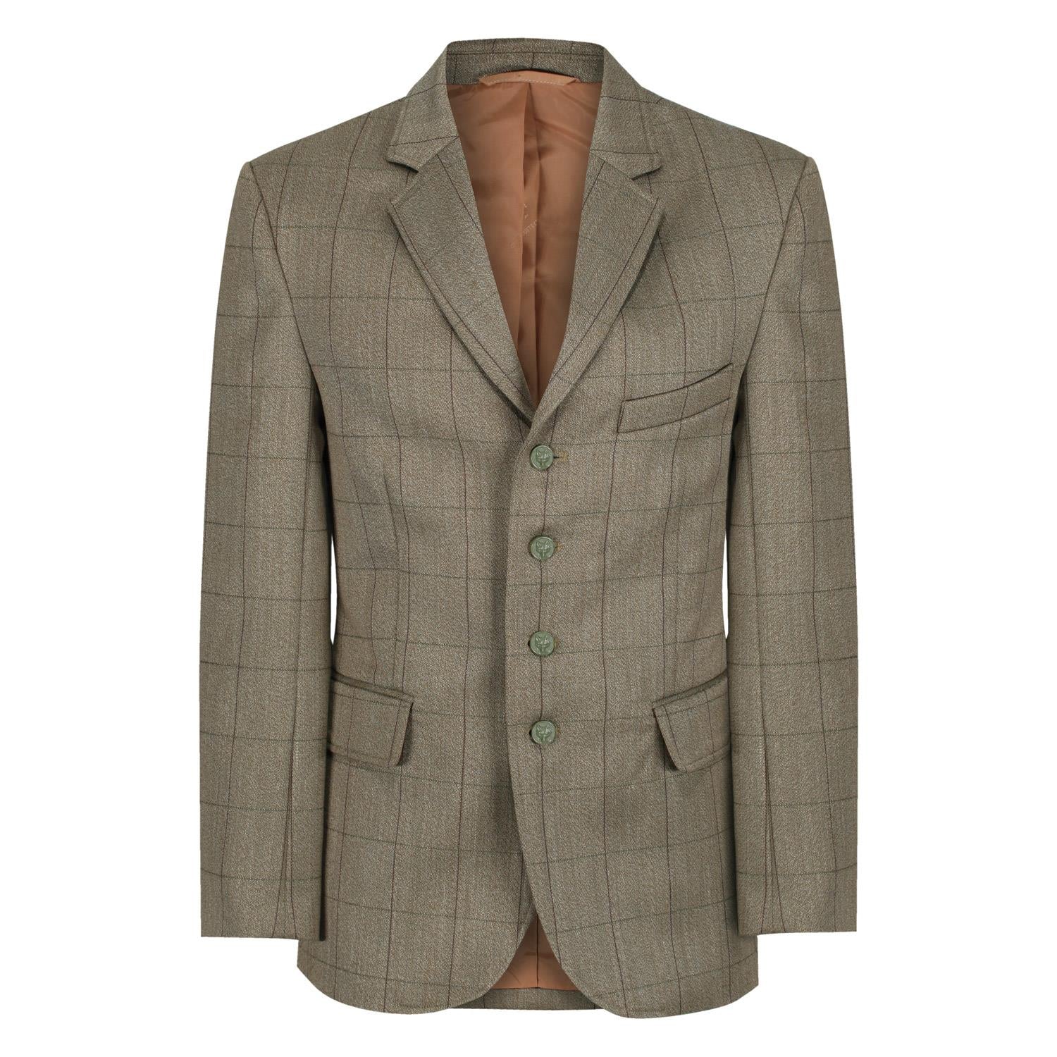 Exclusive Equetech� olive tweed jacket with subtle green and brown over checks. Features flap pockets with concealed zips, chest pocket, foxhead buttons, rich gold Equetech� jacquard lining, double back vents and supplied with jacket bag and spare buttons.