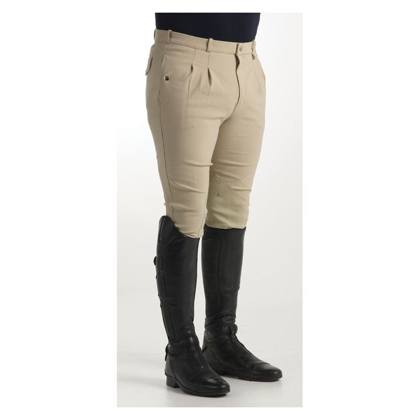 Made from agate cool fabric containing 30% polyamide, 63% cotton and 7% lycra, completed with stretch leather knee patches. Traditionally styled with a pleated front, side pockets with a stud closure and back pocket with stud closure. Machine washable at 40°C. Leg Length: Regular.