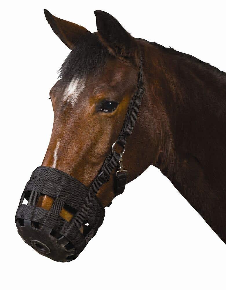 Rubber grazing muzzle designed to restrict grazing when the horse is turned out. Adjustable headpiece and trigger clip on throat lash.
