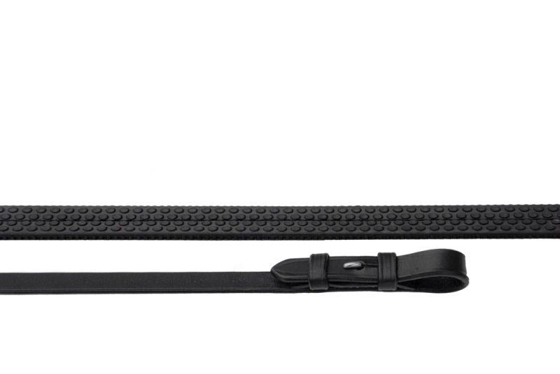 English leather reins with a rubber grip ideal for everyday use. These reins feature hook stud billets and stainless steel fittings. Handcrafted from the finest English leather stainless steel fittings. Length 54", Width 5/8"