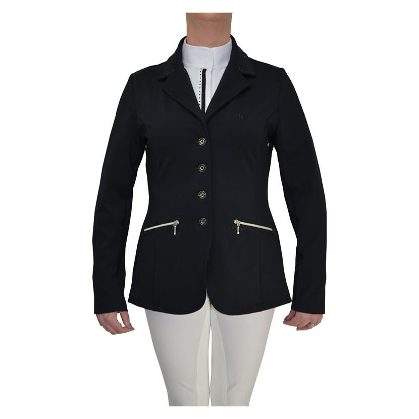 This gorgeous show jacket is the essential addition to your competition wardrobe! The sophisticated design incorporates black glitter panels along the collar that catch the light, matching the black glitter panels that line the silver zipped pockets. Designed with softshell material to guard against light showers and offer flexibility in the saddle, the comfort of this jacket is enhanced with the air vents under the arms to help you keep cool. Fastened with four silver lined black buttons for a secure fit, this show jacket is the ultimate choice for those who want to make an impression.