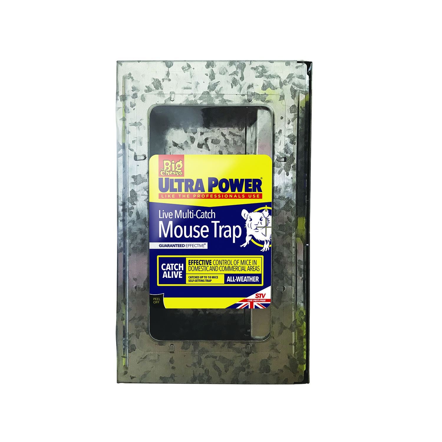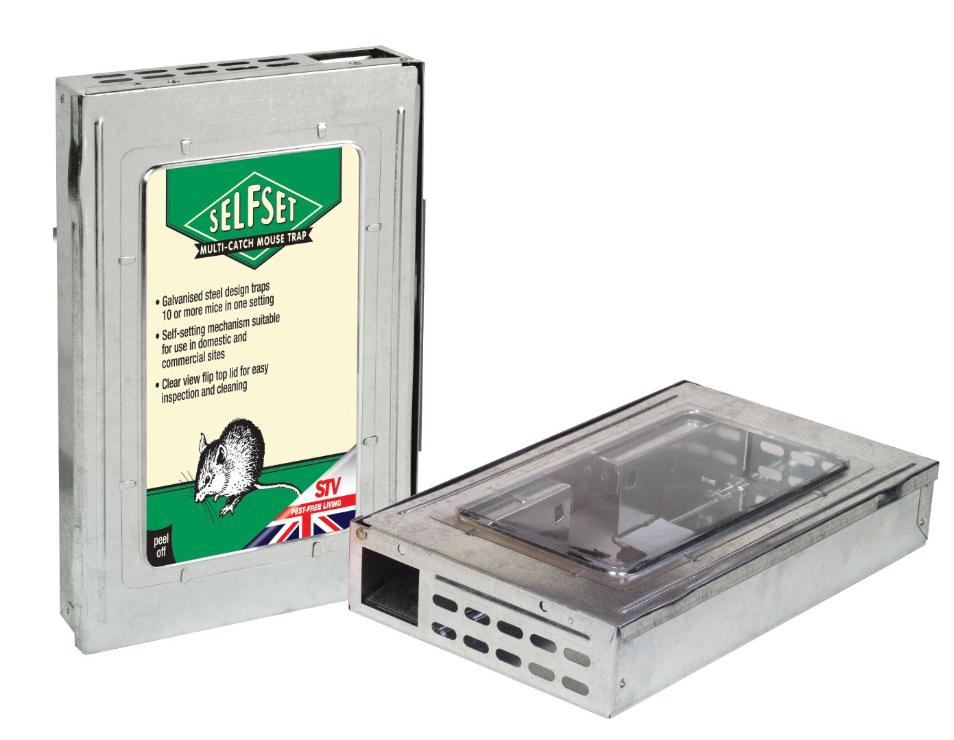 Galvanised steel design traps ten or more mice in one setting. Self-setting mechanism suitable for use in domestic and commercial sites. Clear view flip-top lid for easy inspection and cleaning.