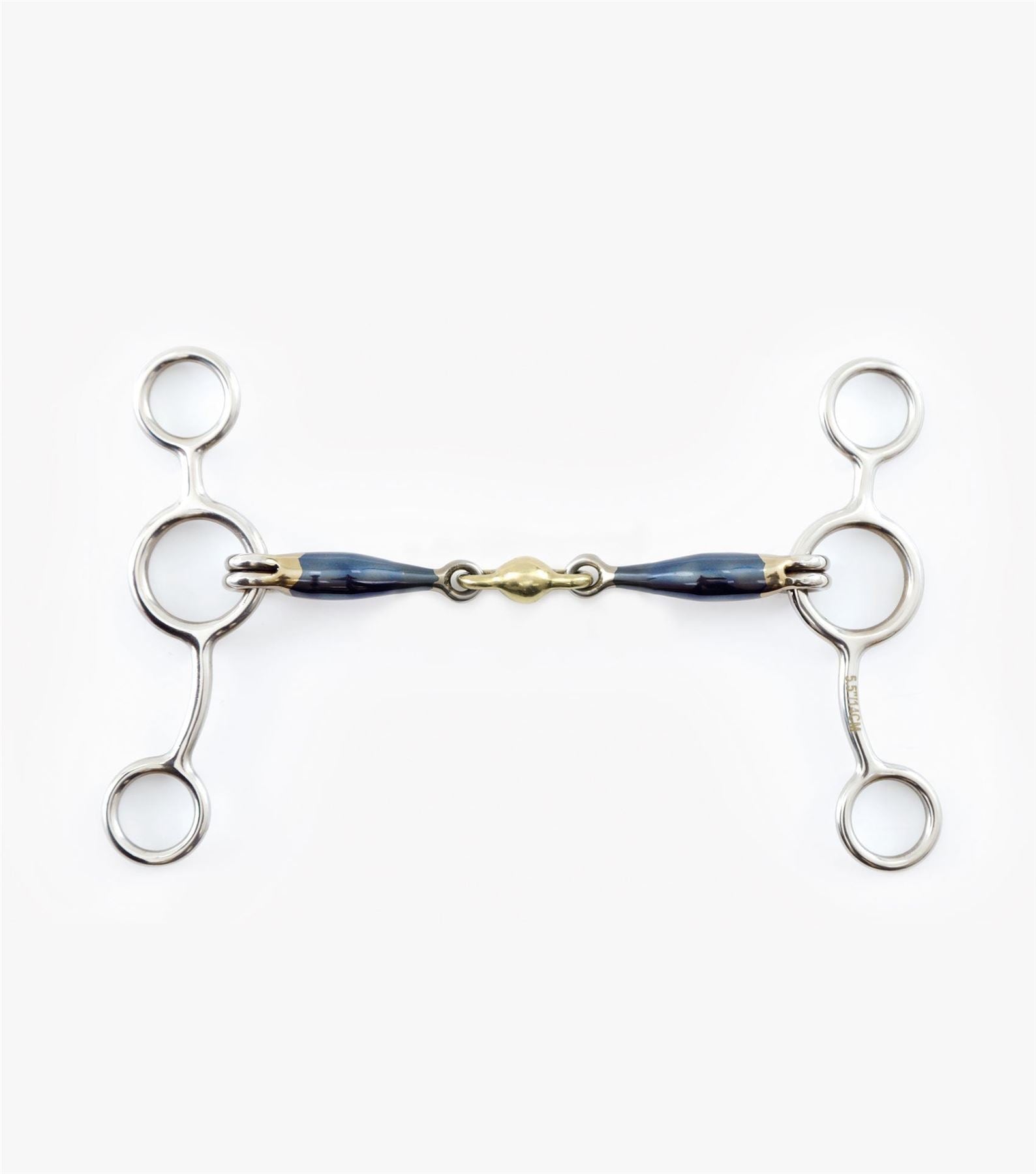 The tom thumb bit is a cross between an American gag and an elevator bit. It offers more precision and control and is very popular for show jumping and cross country. It has a lifting effect in front which can assist the rider in helping to sit the horse back on its hocks, enabling tighter turns and more efficient jumping. The uplifting action combined with poll pressure can also discourage horses from leaning on the bit. Can be used with one rein on either the snaffle ring or the lower ring or alternatively, for increased precision, with two reins. Blue sweet iron oxidises easily which creates a warming sensation and a sweet taste in the horse's mouth, helping them to accept the bit. Please note that the blue colour will fade with use, this is normal. Measurements As per our size guide the A & B measurements of this bit are as follows: A=15mm B=125mm Blue Sweet Iron Horse Bits... Blue Sweet iron bits oxidise easily which creates a warm sweet taste in the horse's mouth, encouraging them to salivate. Some horses often prefer the warm sensation of sweet iron compared to stainless steel which is naturally colder. Sweet iron bits are therefore ideal for sensitive horses or horses that need encouragement to mouth and accept the bit.