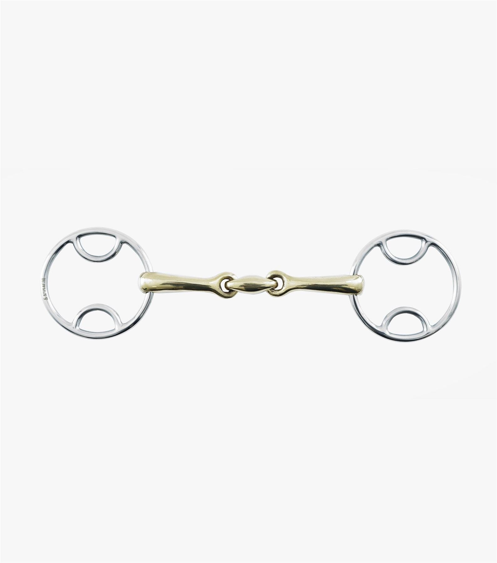 Loose ring bit with fixed rein positions Double jointed, durable brass alloy mouthpiece with lozenge Two leverage options - attach reins to middle ring for a mild action or to the fixed point at the bottom for more leverage Bit rings are larger on the 5" & 5.5" so that the bit remains in proportion with the horses head This bit is NOT BD Legal Bit strength: Mild