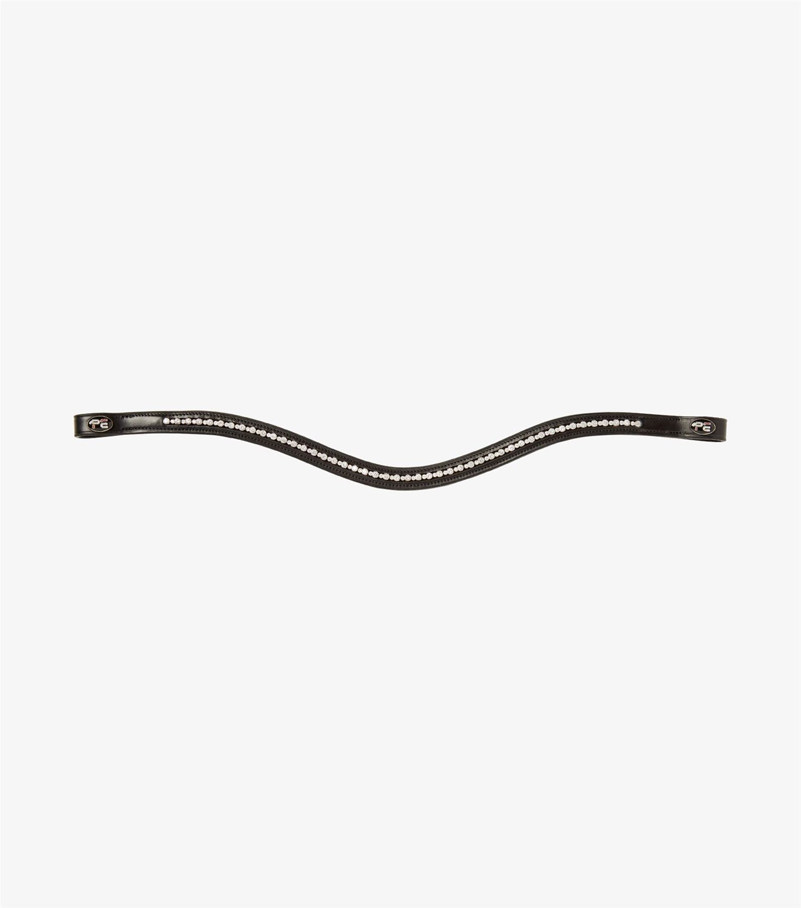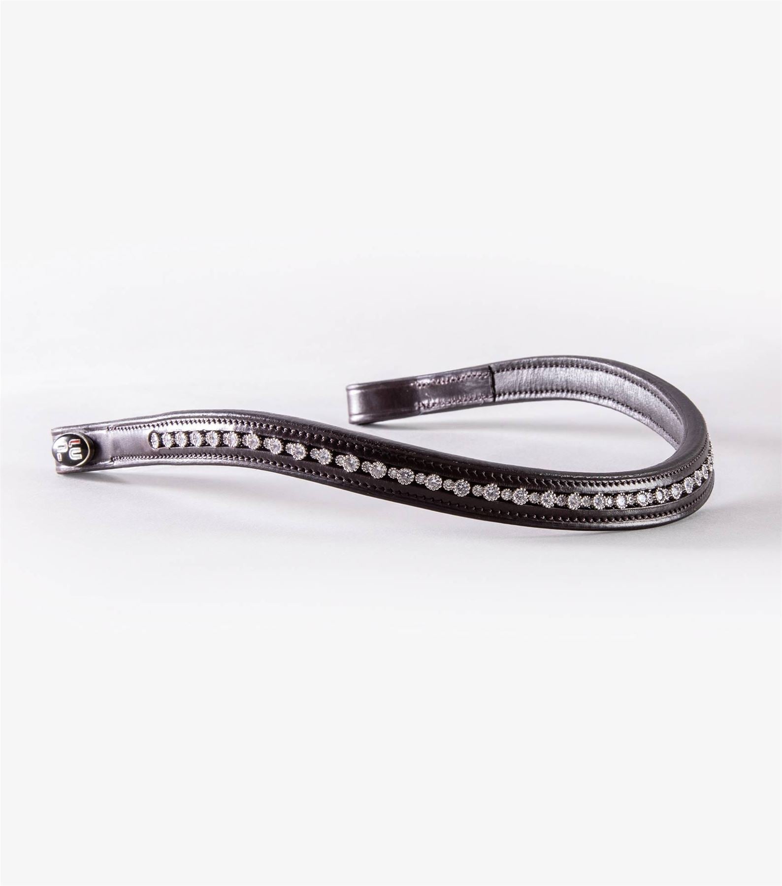Italian leather browband Deep-set alternating sized shimmering stones Delicate jewellery look Uniquely shaped PE branded brooches Looped at either end to attach the bridle