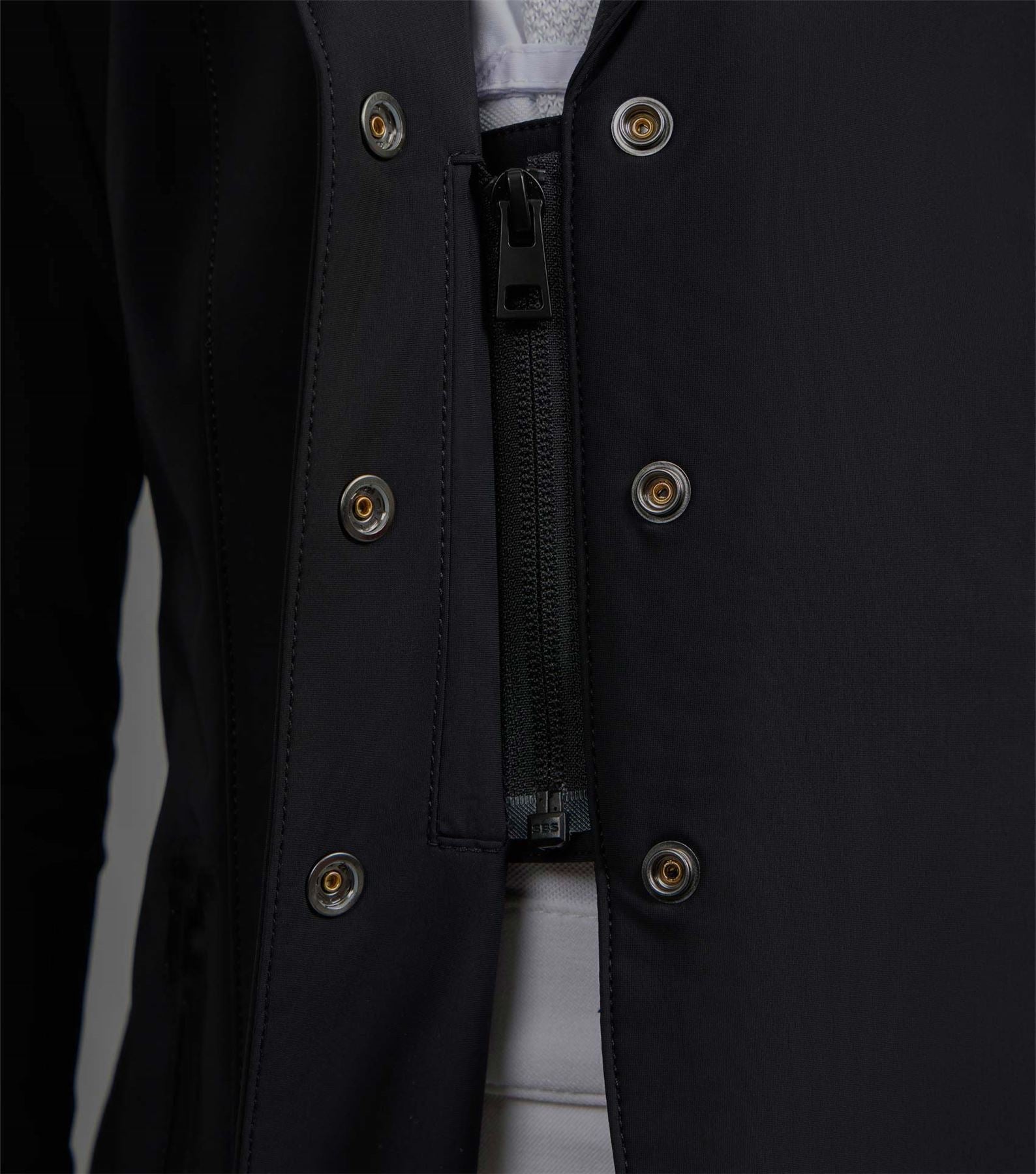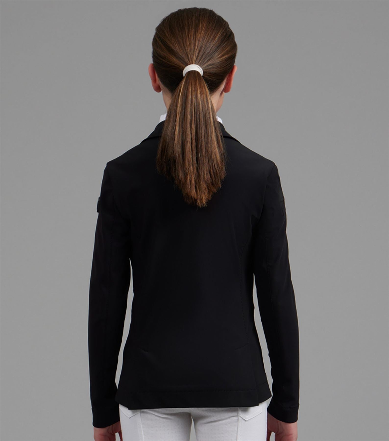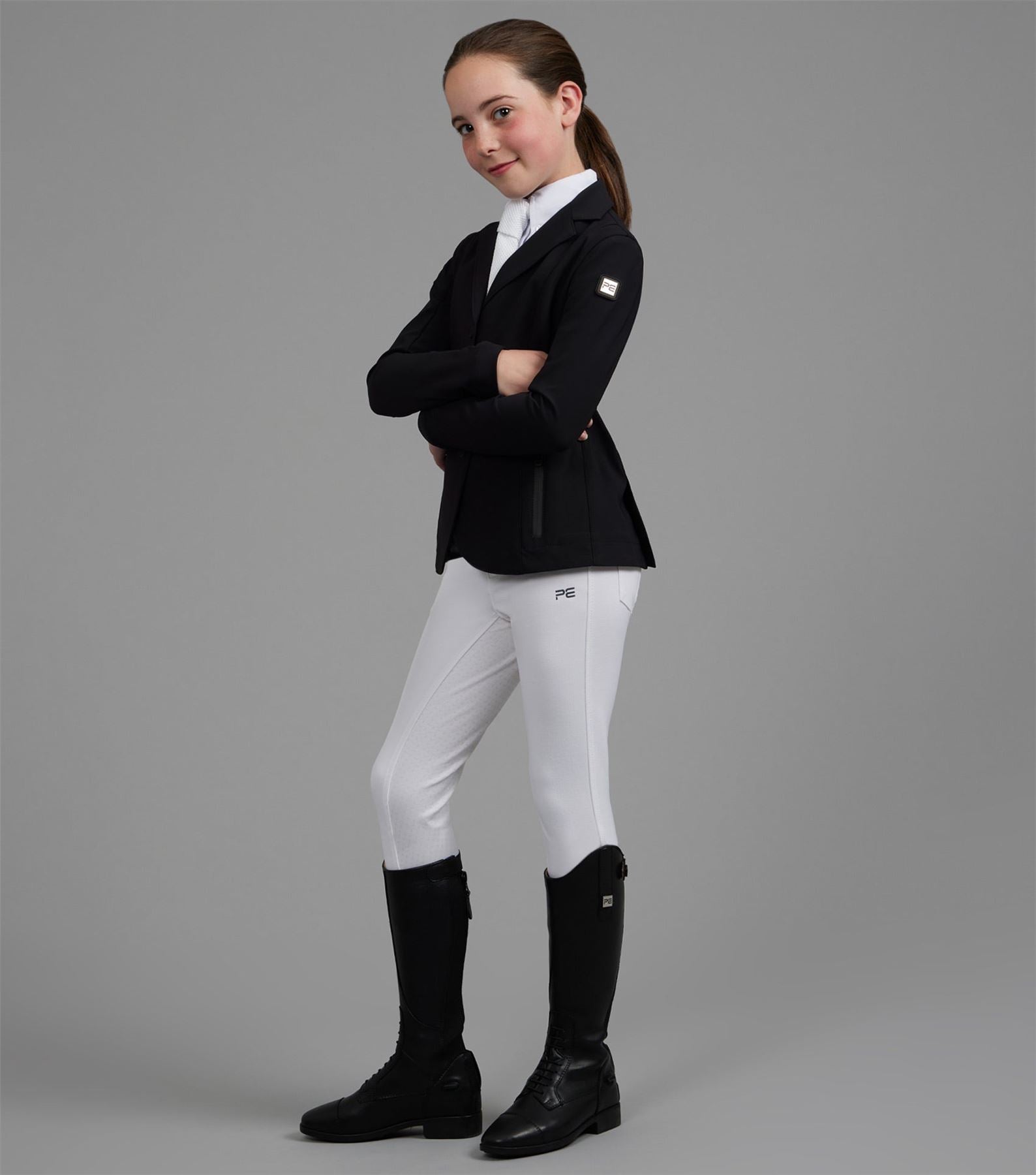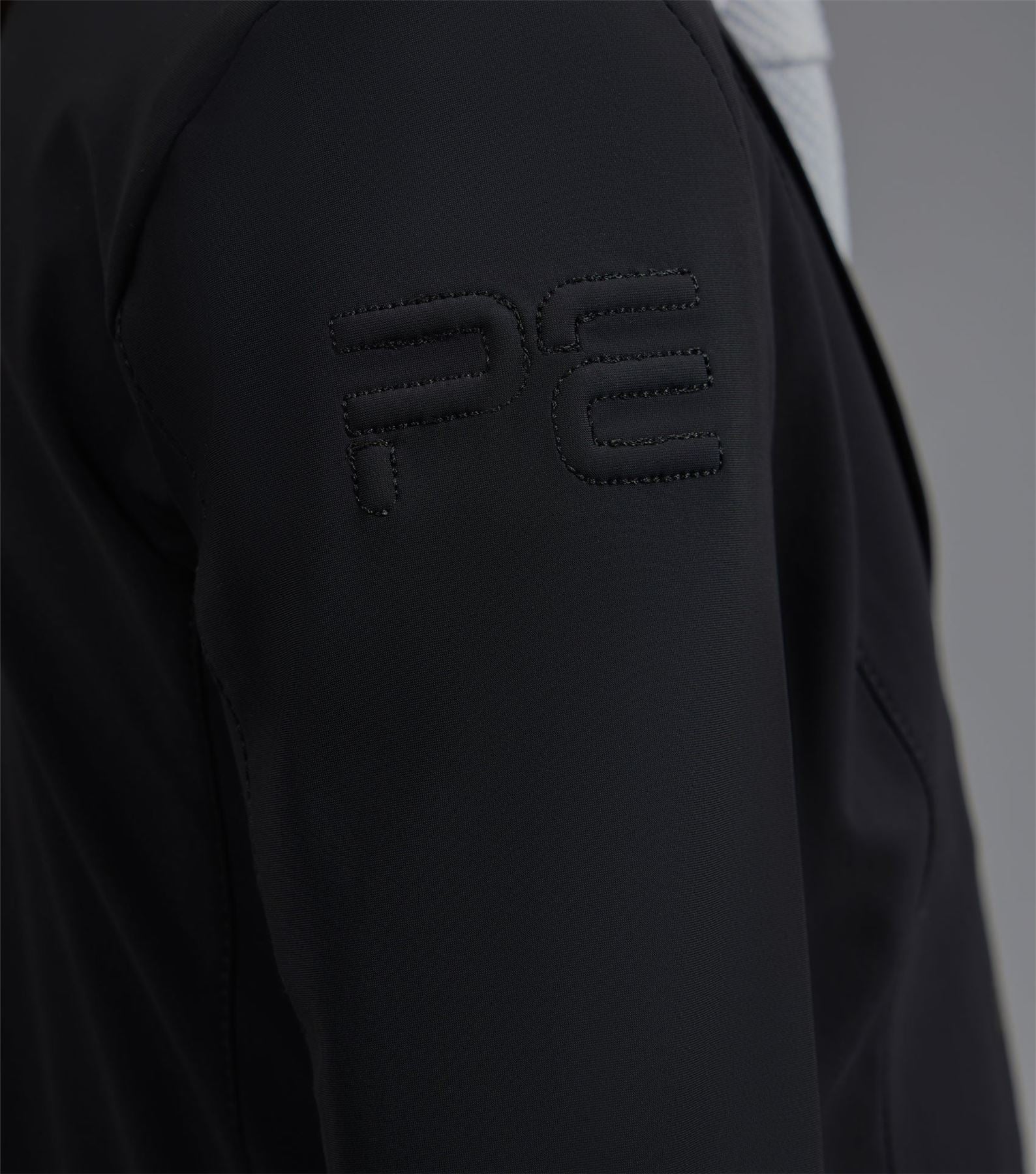 Discover new heights of performance equestrian wear, with intense attention to detail and innovative fabric technology. Focusing on high-quality fabrics and technical materials, the BLACK LABEL represents the pinnacle of refined aesthetics, elite performance and timeless craftsmanship. This girls competition jacket is ideal for a wide variety of equestrian disciplines. This jacket is crafted from a lightweight sleek material that feels luxuriously soft to the touch and comfortable against your skin. The construction provides multidirectional stretch for enhanced freedom of movement whilst offering improved breathability, perfect for the intensity of competition.  Classically cut, this competition jacket is formed to provide a flattering silhouette, with meticulously placed style lines. A traditional notched lapel collar sits at the top of a YKK zip, concealed by a clean press stud closure. Two pockets offer a place for storing your valuables, with added security provided by the zip closures of a matte finish. The subtle matte styling continues across the finer details of this jacket, including the branded press stud closures and PE branding at the periphery of the cuff. Our signature chrome PE badge is situated on the rider�s left arm, presenting continuity with our existing collection. An embossed PE form is elegantly rested on the rider�s right arm, boasting the quality and functionality of this luxury performance jacket.  An elegant statement piece, this competition jacket is sure to provide a classic sophisticated aesthetic. The soft shade of French Navy allows you to leave a professional impression in the arena, rejuvenating your competition wardrobe.  Innovation is in our company DNA. We have taken decades of expertise into new and exciting innovations within performance textiles. Surpassing the limits of current industry standards, every detail is considered, bringing new heights to your equestrian wear. The Evinco Girls Competition Jacket is a key representative of these values, allowing luxury, high-end designs to be accessible and affordable.