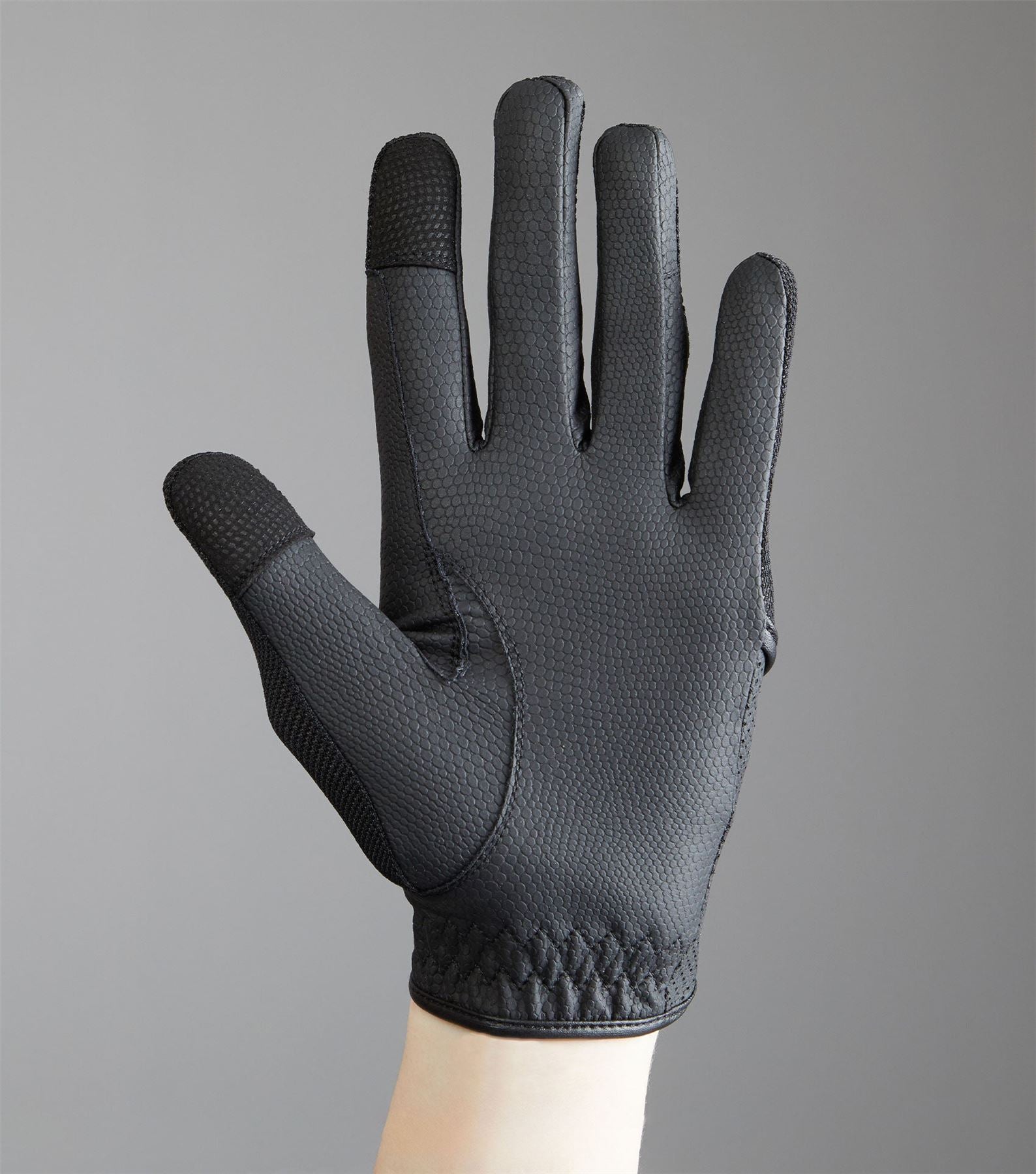 Riding is made comfortable with the Presa Mesh Riding Gloves. Featuring a full panel of ultra-breathable mesh with four-way stretch properties allowing unrestricted movement. The airy mesh design allows heat to escape and cooling airflow to reach your hands. The palm of the glove is made from lightweight synthetic leather, providing optimum grip on the reins. A touch screen panel on the index finger and thumb allows for use of your phone without removing your gloves. Complete with Velcro closure with an elegant PE branded badge, these riding gloves are ideal for your everyday equestrian activities and competition use.