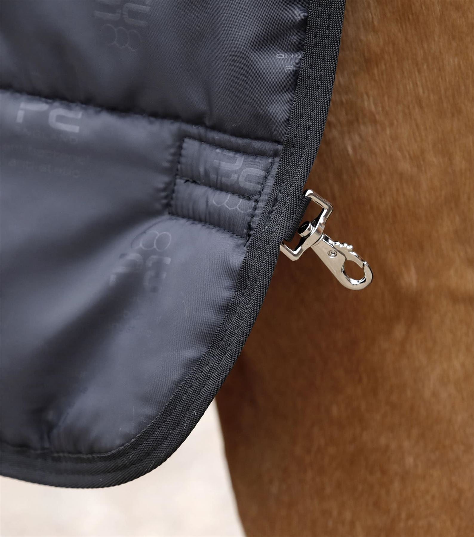 Available in 100g and 250g weights Thermo bonded fill Crafted from antibacterial and anti-static breathable polyester Forward cut neckline Channel quilted monogram design on fabric and lining Attachments compatible with Premier Equine Lucanta rug range 2 neoprene wither pads Highly breathable Double front fastening Easy to attach to outer rug Stainless steel hardware Designed to contour over the wither and rump area Your Lucanta Rug Liner comes inside a complimentary, reusable zip-fastened storage bag
