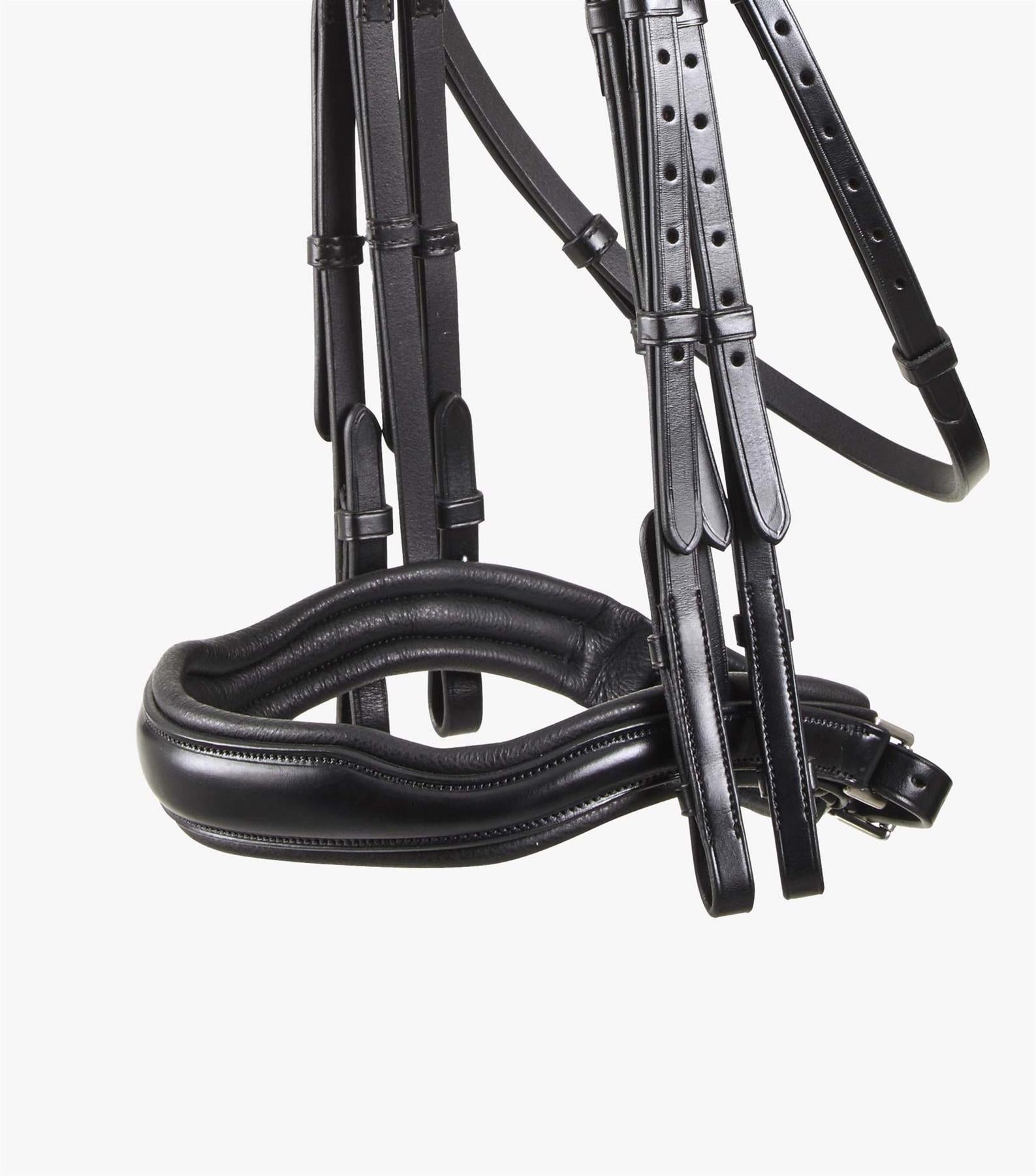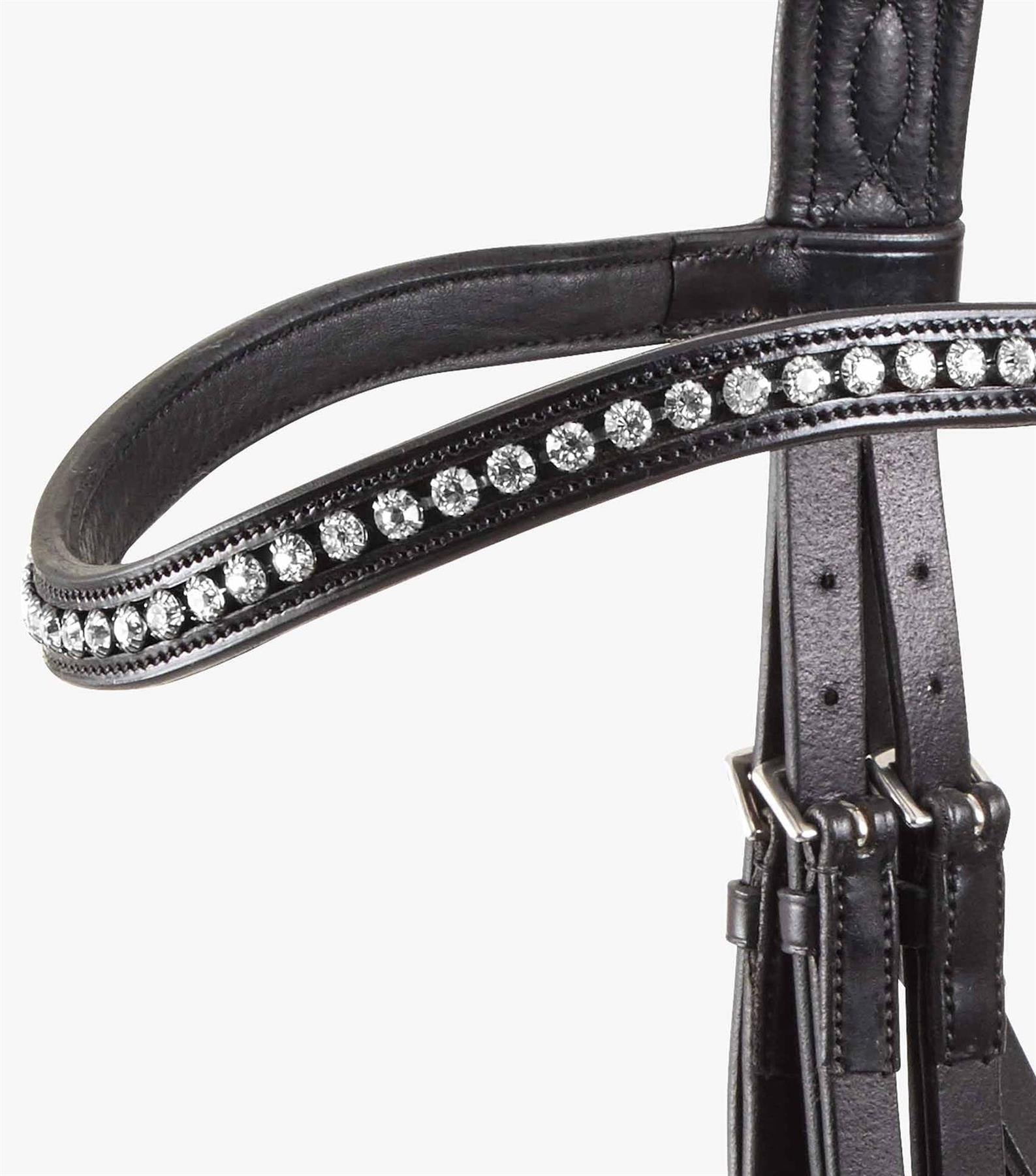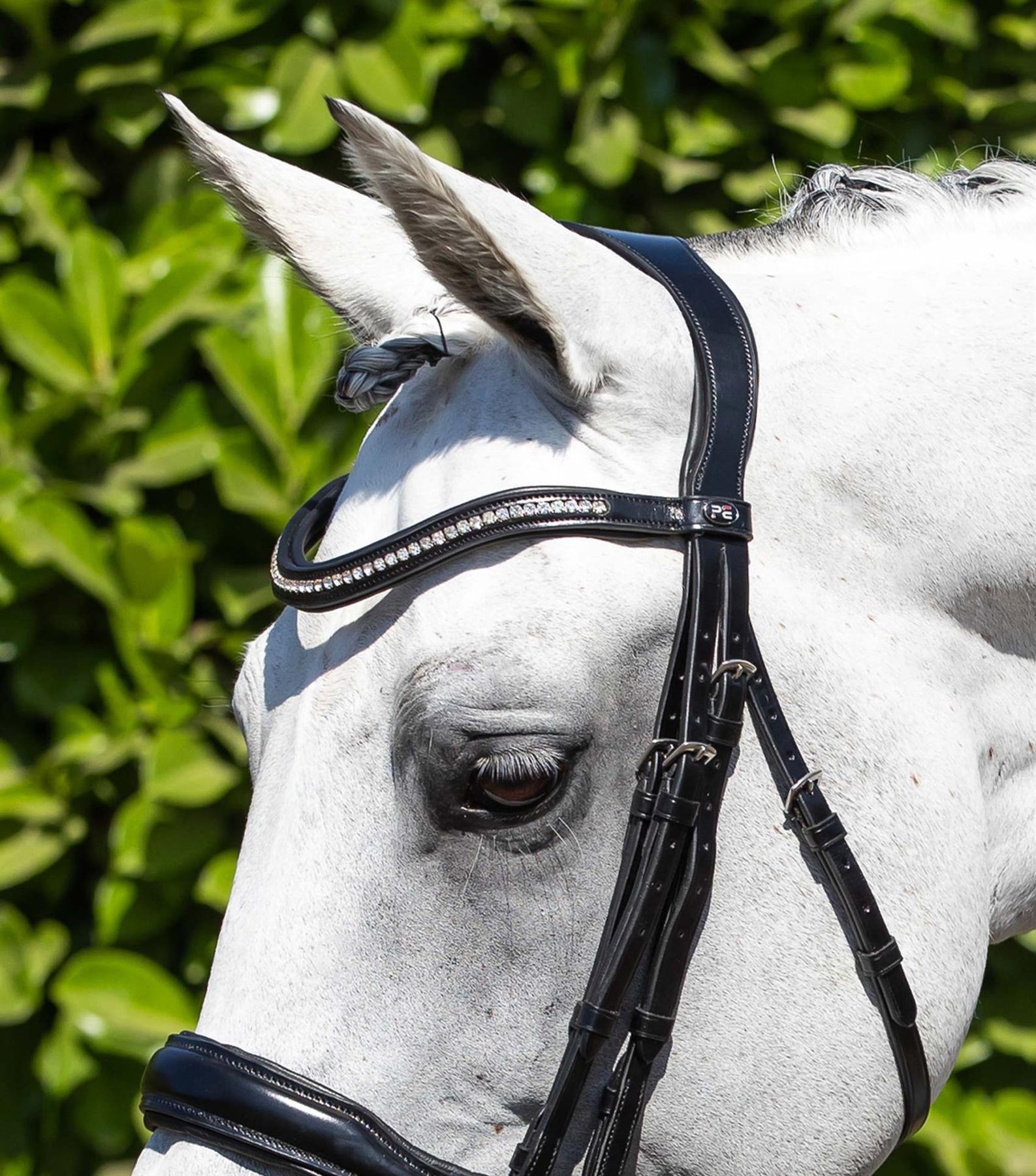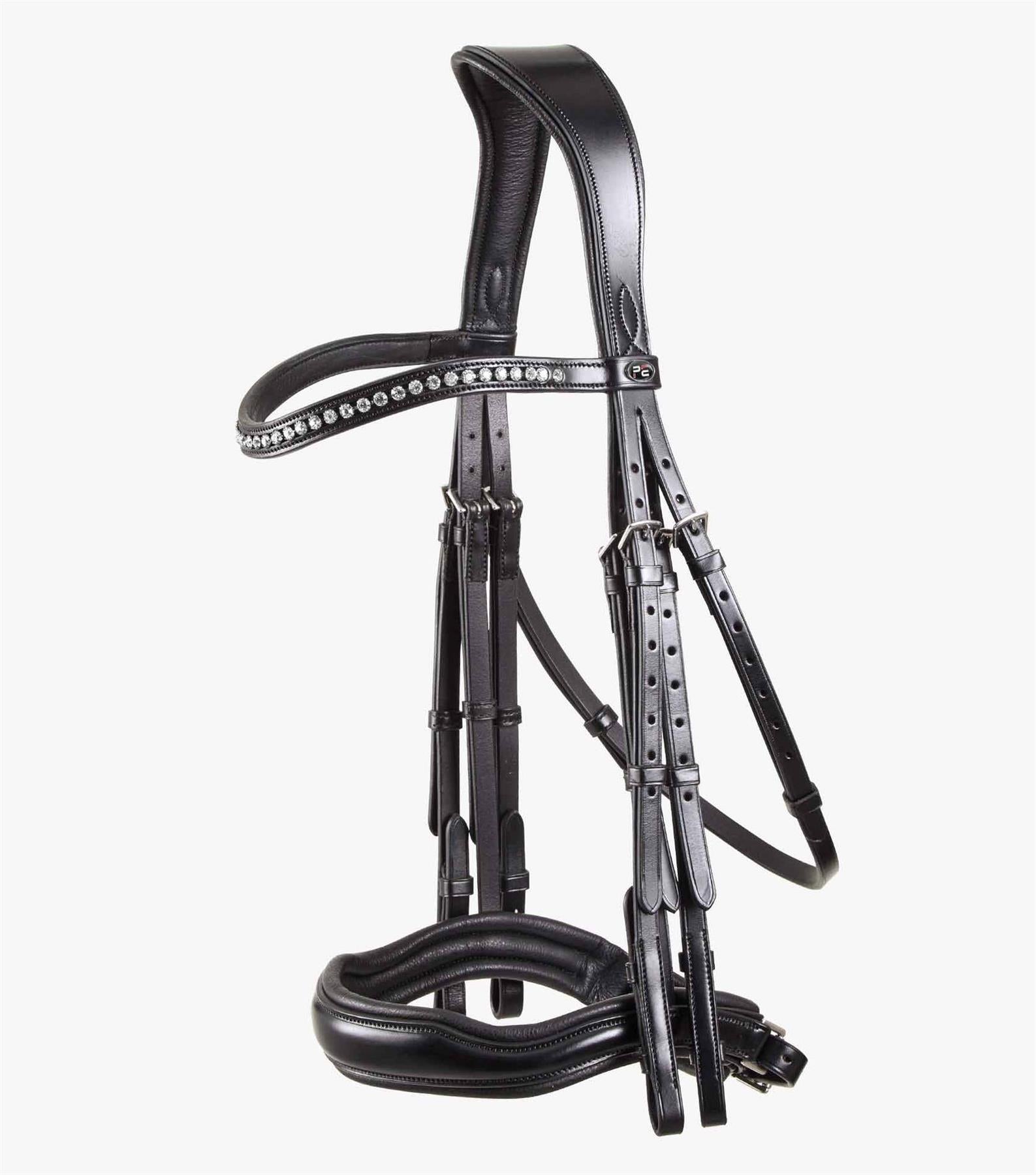 Italian leather double bridle Anatomically shaped soft padded poll piece Elegantly shaped diamante browband with 'PE' branded brooch either side Cheek pieces with billet fastenings Throat lash, adjustable at both sides Soft padded anatomic crank noseband Stainless steel buckles and billets Reins not included