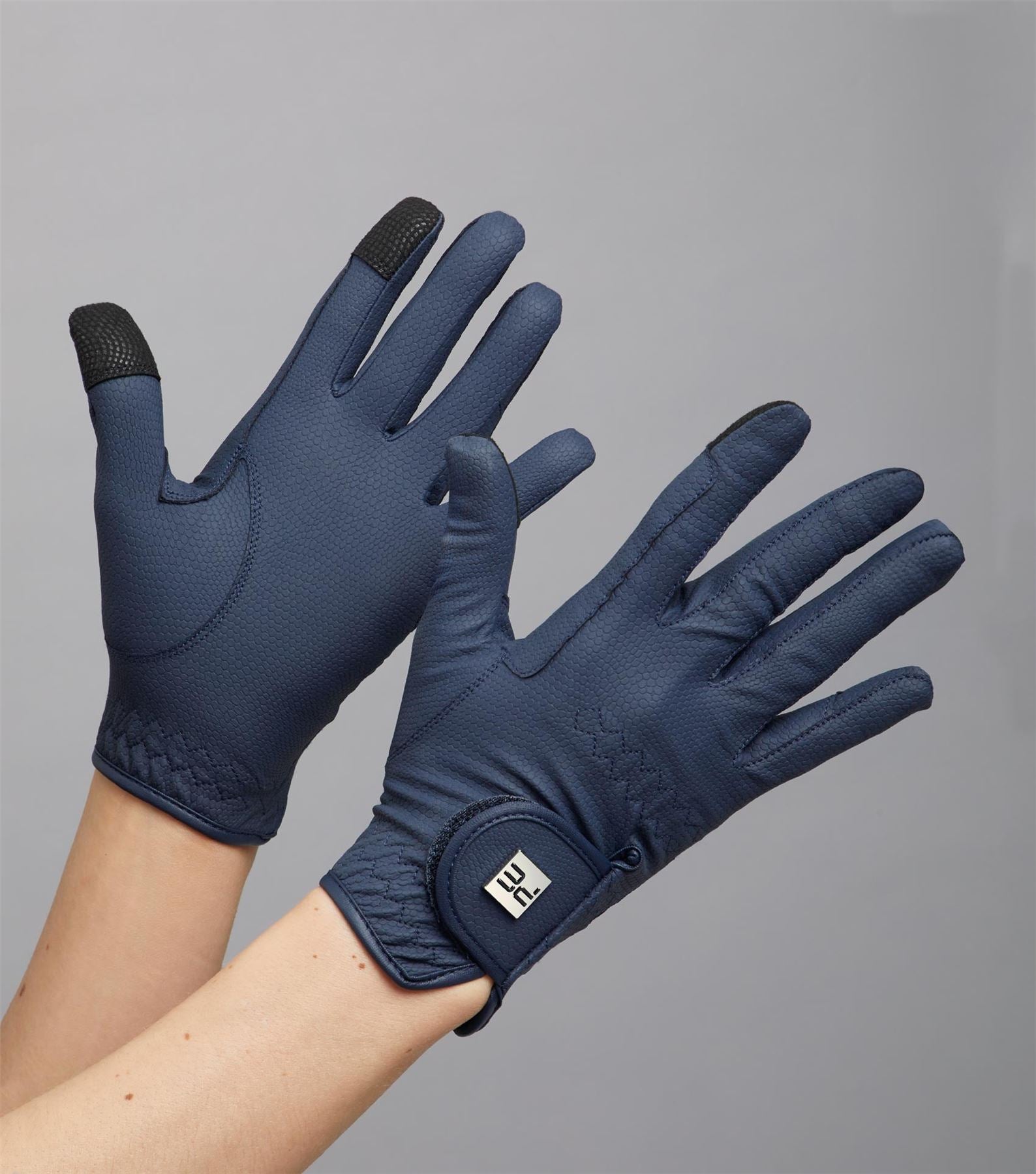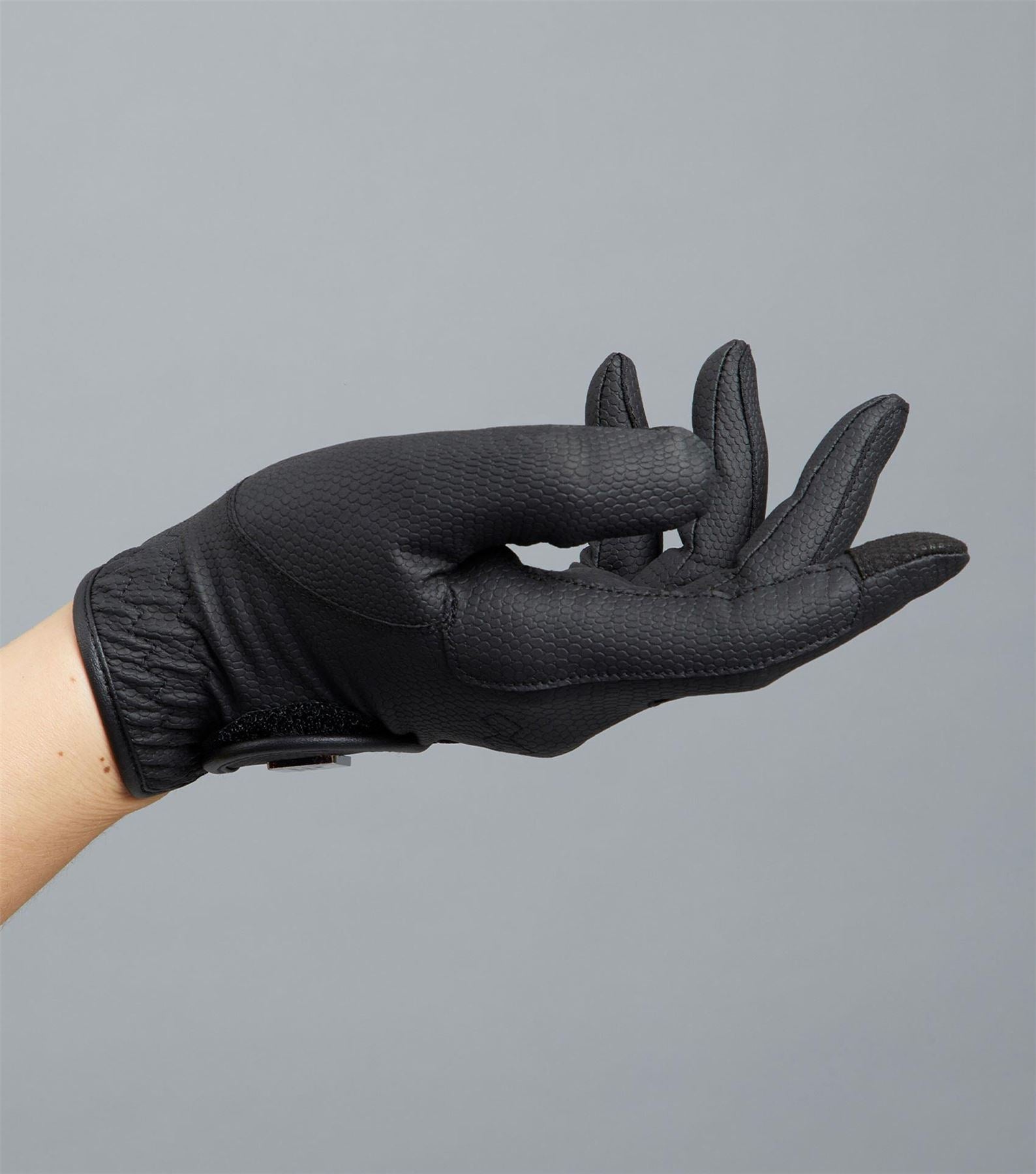 The Metaro Riding Gloves offer a sophisticated, modern look with a reptilian textured surface for exceptional grip. Featuring an integrated central elastic stretch panel for unrestricted flexion and elastic stretch around the wrist for a contoured fit. A reinforced panel along the index finger where the rein sits ensures durability and touch screen panels on the index finger and thumb allow use of your touch screen phone without removing your gloves. A modern look that performs, complete with pull-tight adjustable Velcro fastening, finished with �PE� branding.