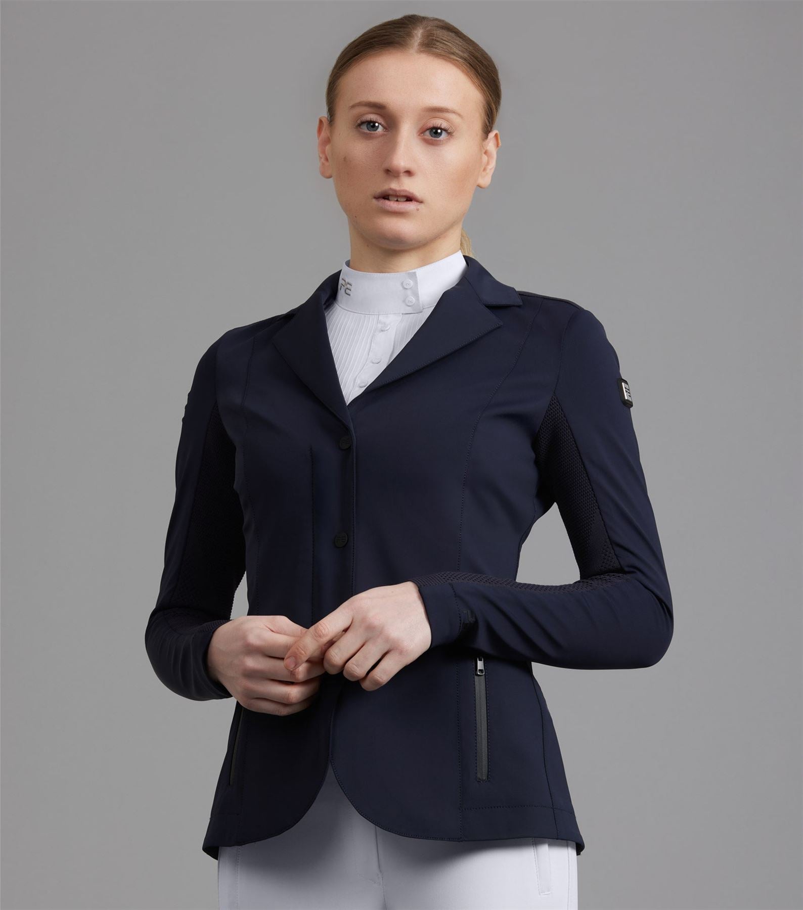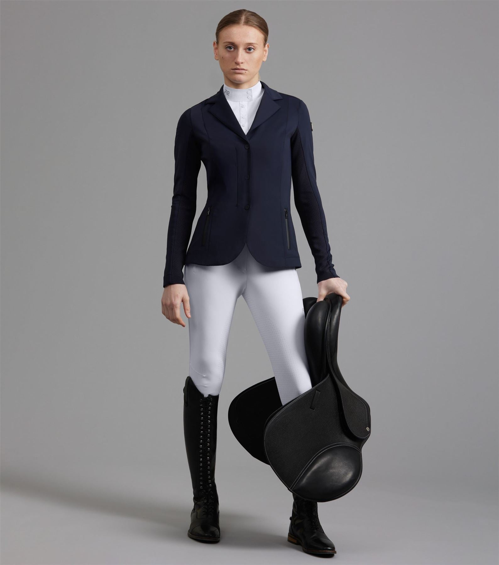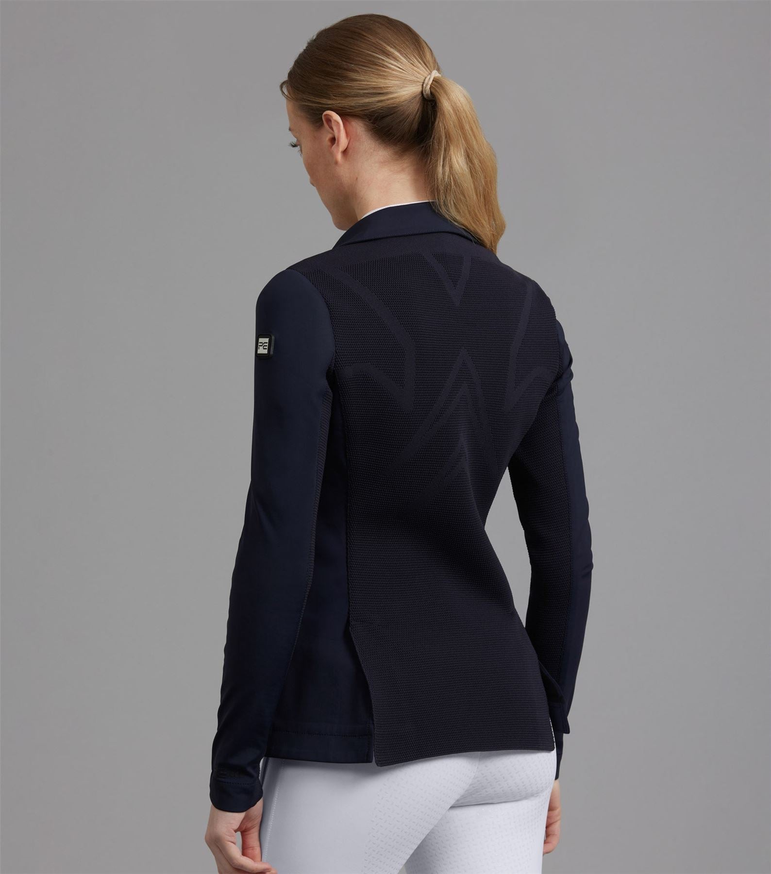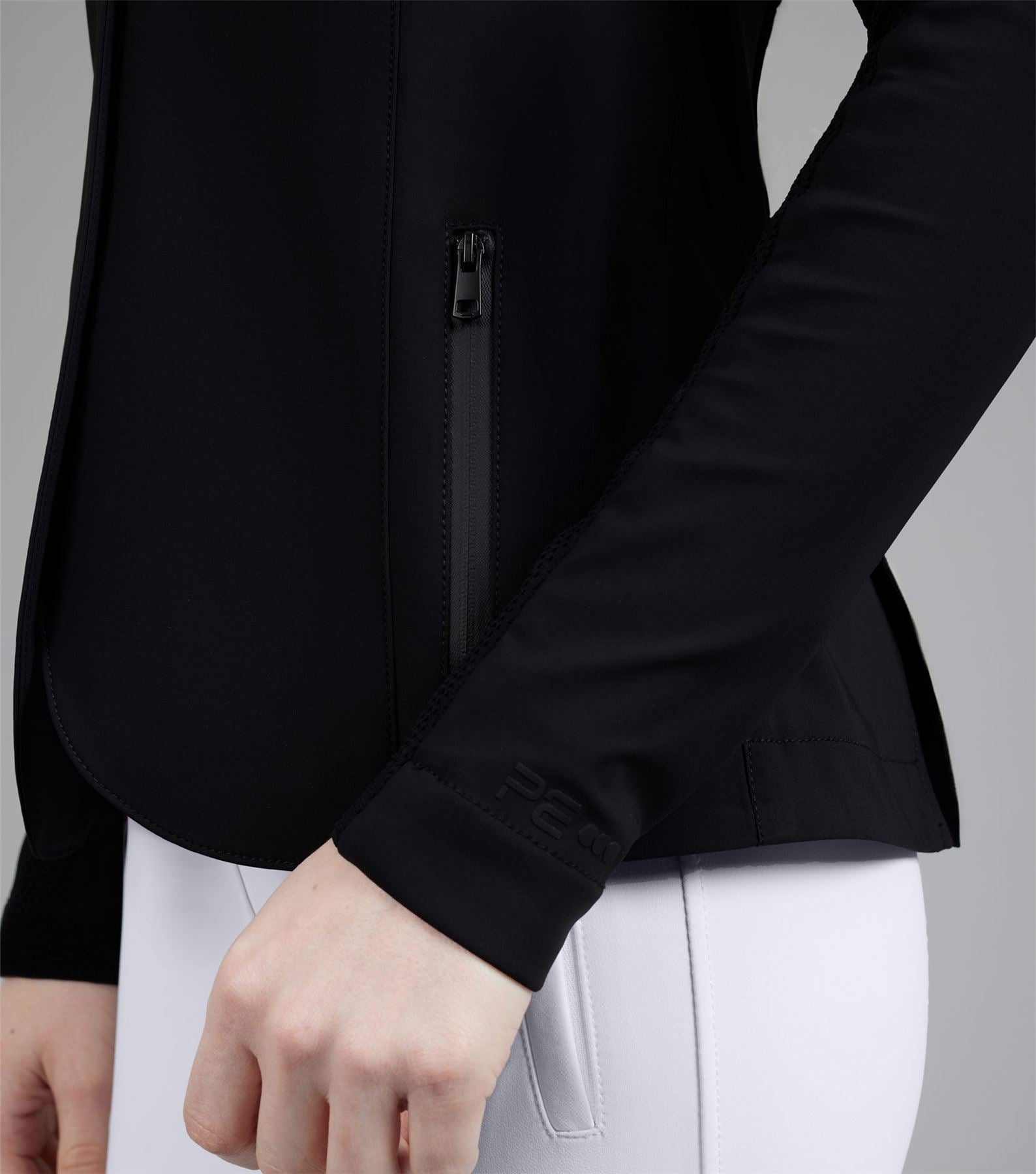 Discover new heights of performance equestrian wear, with intense attention to detail and innovative fabric technology. Focusing on high-quality fabrics and technical materials, the BLACK LABEL represents the pinnacle of refined aesthetics, elite performance, and timeless craftsmanship. This ladies competition jacket is ideal for a wide variety of equestrian disciplines. The construction of this innovative design combines panels of differing technical fabrics. The face of this jacket is crafted from a lightweight sleek material that feels luxuriously soft to the touch and comfortable against your skin. Evolved for the modern rider, the back and arms incorporate a technical 3D knit which is moulded to the muscular anatomy of the back and shoulders of the rider. This innovative construction allows for enhanced freedom of movement whilst creating unparalleled breathability, perfect for the intensity of competition. Classically cut, this competition jacket is formed to provide a flattering silhouette, with meticulously placed style lines. A traditional notched lapel collar sits at the top of a YKK zip, concealed by a clean, press stud closure. Two pockets offer a place for storing your valuables, with added security provided by zip closures of a matte finish. The subtle matte styling continues across the finer details of this jacket, including the branded press stud closures, and PE branding at the periphery of the cuff. Our signature chrome PE badge is situated on the rider�s left arm, presenting continuity with our existing collection. An embossed PE form is elegantly rested on the rider�s right arm, boasting the quality and functionality of this luxury performance jacket. An elegant statement piece, this competition jacket is sure to provide a traditional, timeless appearance. The deep shade of Jet Black allows you to leave a professional impression in the arena, rejuvenating your competition wardrobe. Innovation is in our company DNA. We have taken decades of expertise into new and exciting innovations within performance textiles. Surpassing the limits of current industry standards, every detail is considered, bringing new heights to your equestrian wear. The Quarto Ladies Competition Jacket is a key representative of these values, allowing luxury, high-end designs to be accessible and affordable.