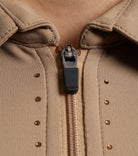 Breathable Lightweight �/? zip closure Sophisticated shirt collar 4-way stretch Tonal gemstone embellishment Clear silicone branding