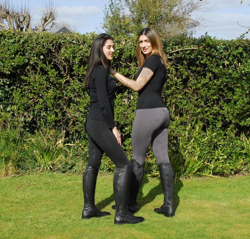 Polyester/Spandex close fitting stretch material (non see-through!) Extra wide elasticated soft waistband with discreet and tidy phone pocket in the back of the waistband rather than on the leg so if you get caught in a rain shower your phone/ valuables won't get wet! Featured with both the Rhinegold Mustang Riding Trainers and the Rhinegold Elite Siena Riding Boot- the perfect partnerships for warmer and cooler months !Super Comfortable Silicone Grip Zip pocket in rear of waistband