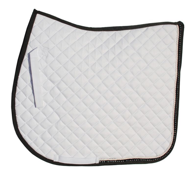Cotton quilted saddle pads with diamond quilting for horses comfort. These gorgeous saddle pads have rope binding and 'crystal' trim for a glamorous look. Black Brown Grey Navy Red White Raspberry Tangerine Turquoise Price differs from catalogue due to increased costs