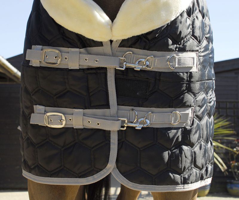 Gorgeous design stable quilt with 150gsm poyfill and micro fleece lining. Multi-adjustable chest fastenings, cross over surcingles and leg straps. Breathable nylon outer Attractive hexagon quilting traps air and maintains warmth 150gsm polyfill Warm to touch fleece lining Large fur collar for comfort and to reduce rubbing Multi adjustable chest fittings Cross over surcingles Leg straps