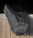 Waterproof ride-on saddle cover with slits for stirrup leathers. Can be used for riding or storing saddles.