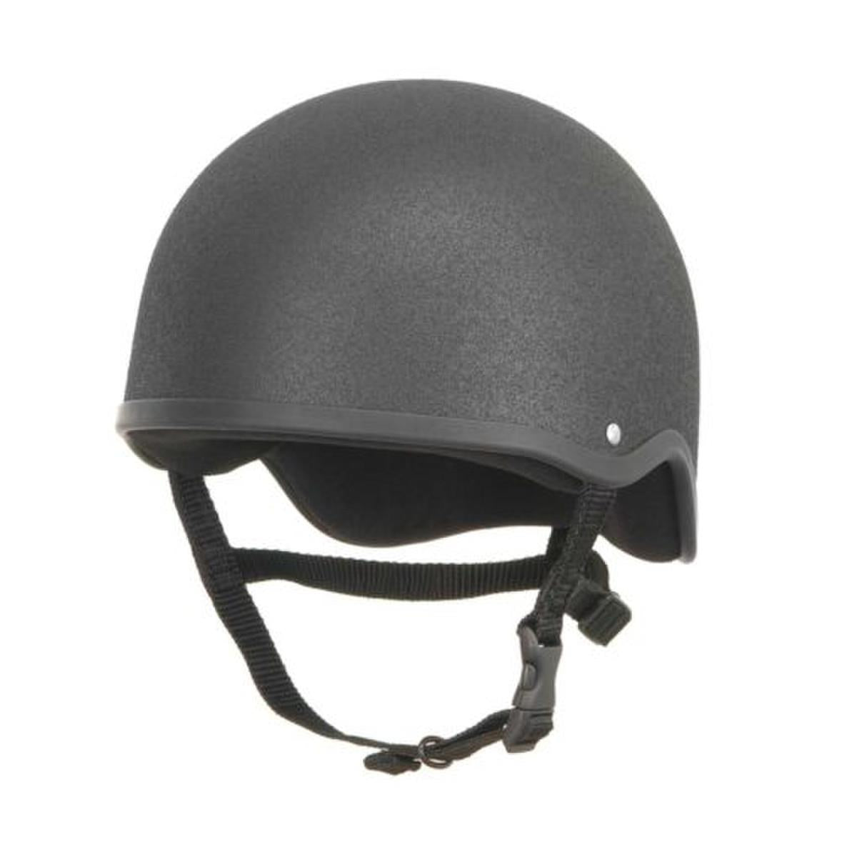 The Junior Plus helmet features Lightweight injection moulded ABS shell with 3-point webbing harness and quick release buckle for ease of use. Durable painted acrylic, sanded finish, crown comfort padding in poly/satin finish/with EPS lining in foam backed brush nylon British PAS 015 2011, VG1, British Kitemarked to PAS 015 2011.